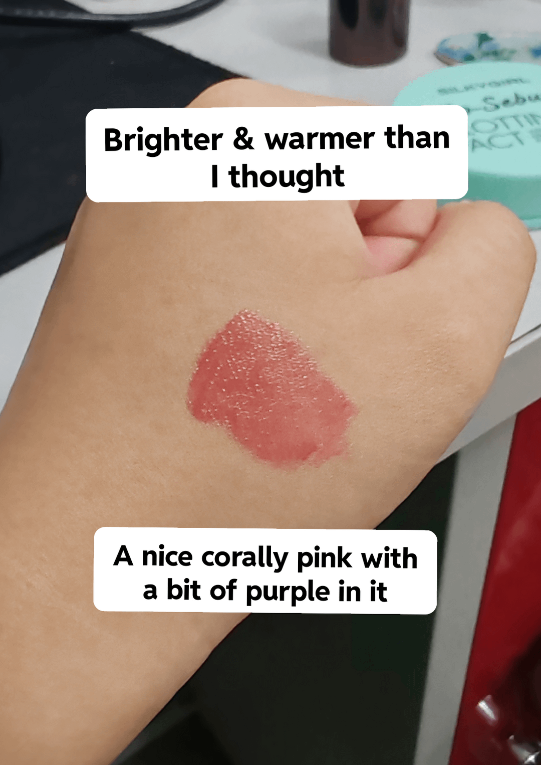 I find this colour a bit too red and a bit too bright. It looks kinda mauvy in the bottle but quickly darkens after a few seconds. The stain is nice and fades beautifully so, I’ll put it on, wait a few minutes, wipe it off l, then put clear gloss over it. I like it