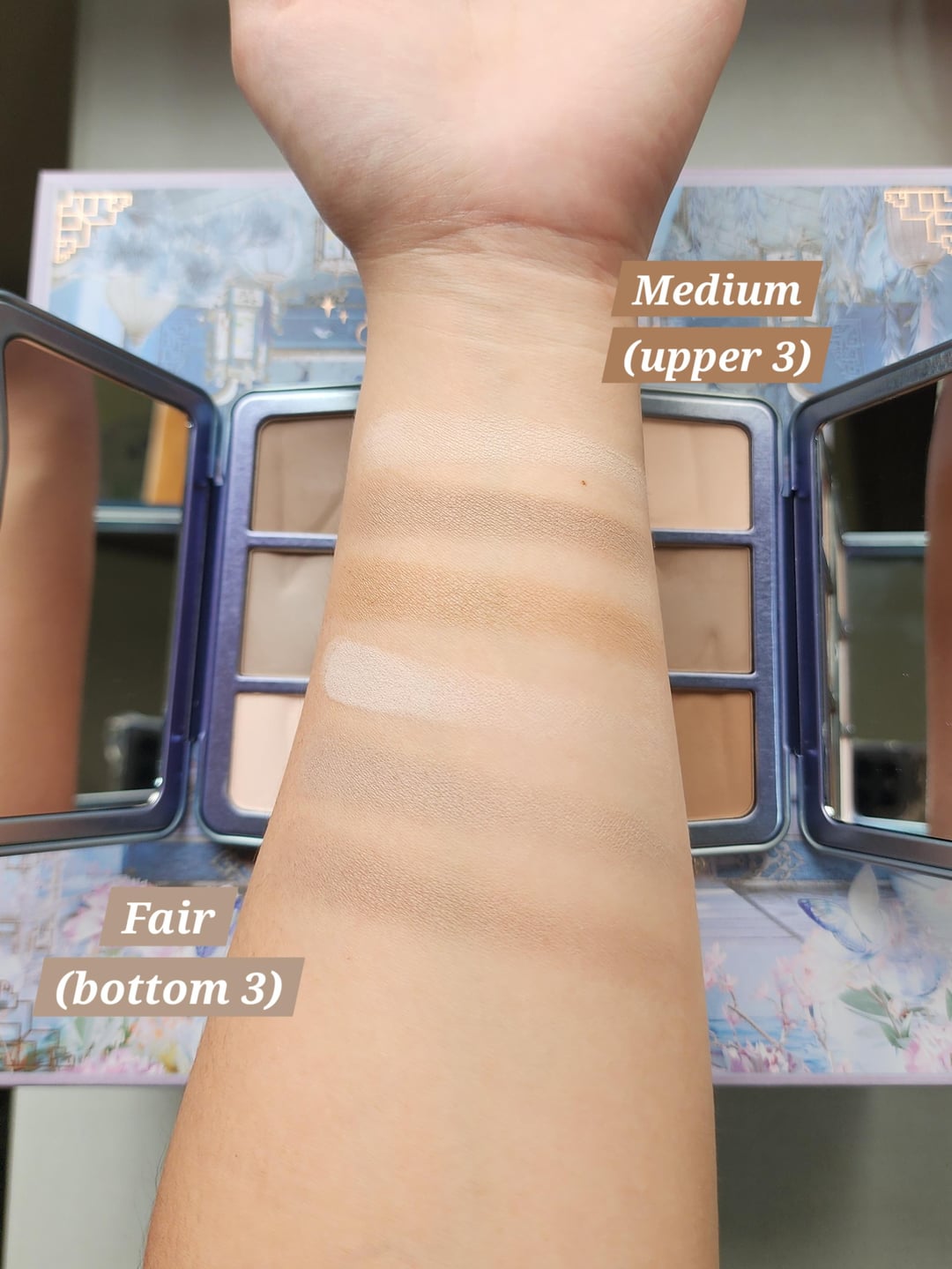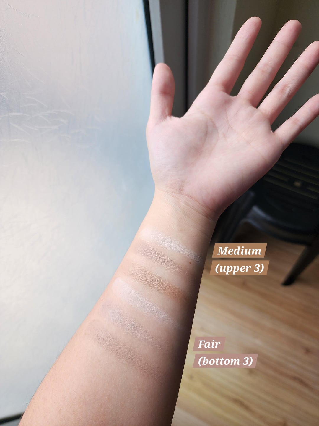 Anyway, this is what Kaleidos Symphony Contour Medium (upper 3) and Fair (bottom 3) looks on my skin.