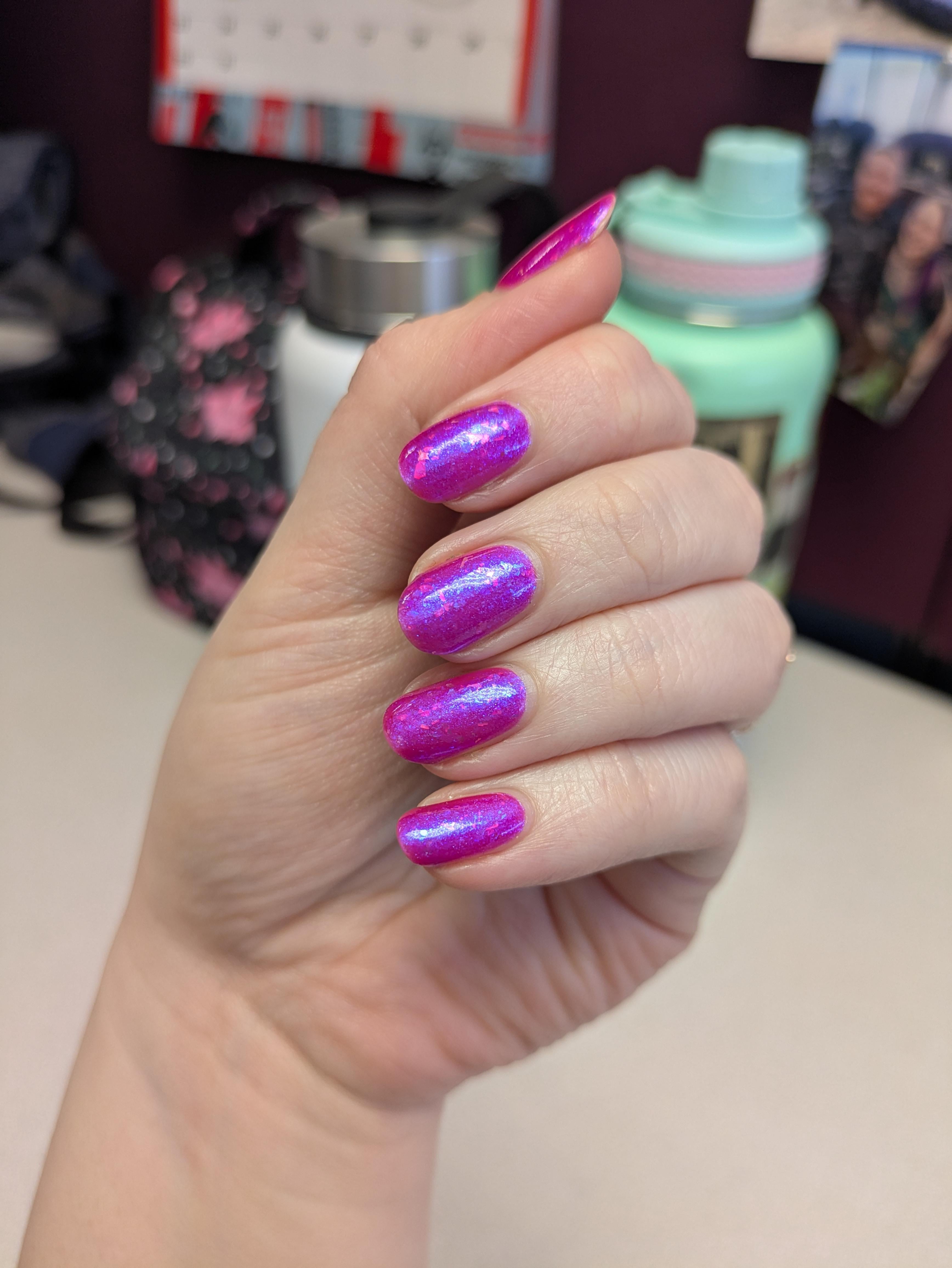 Pulled this very bright out of my comfort zone color for my first springtime mani! Weather here went from 70 and sunny yesterday, to 30 degrees and snow today just to spite me lol. But it’s still the first day of spring anyway! This isn’t a color I would normally reach for. But I love the combination of jelly base, big flakes, and blue shimmer!