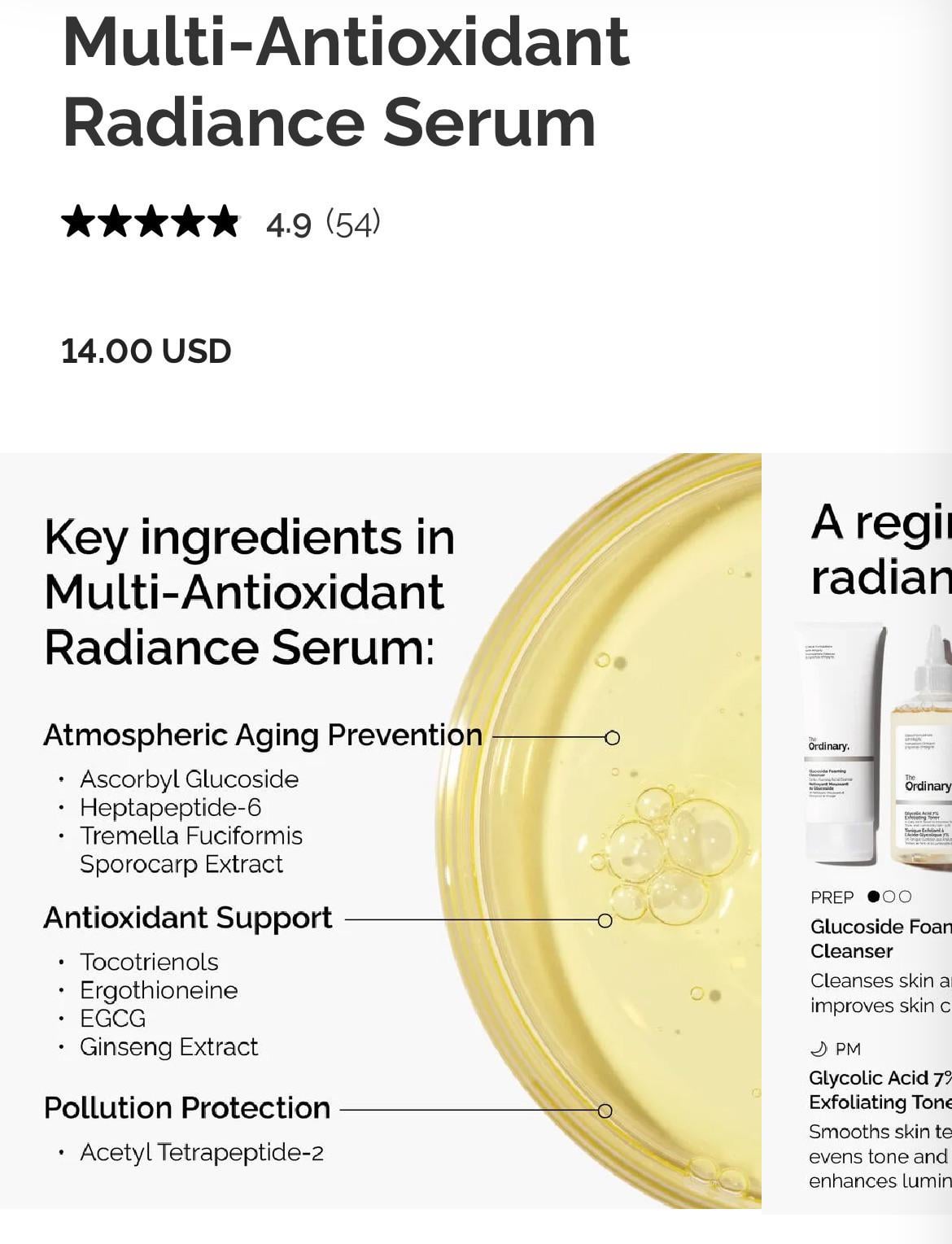>Multi-Antioxidant Radiance Serum is a daily serum combining a wide range of antioxidant and protective technologies to combat multiple concerns associated with environmental damage and visibly brighten dull skin.