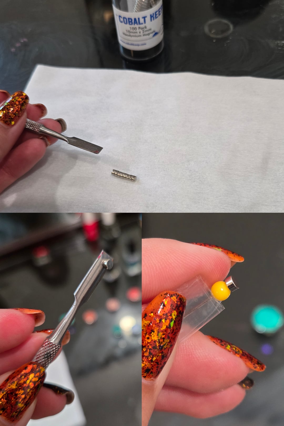 My main mistakes were not waiting long enough for the polish and the glue to cure, and trying to put the magnet down with the metal part of the pin rather than the plastic head.