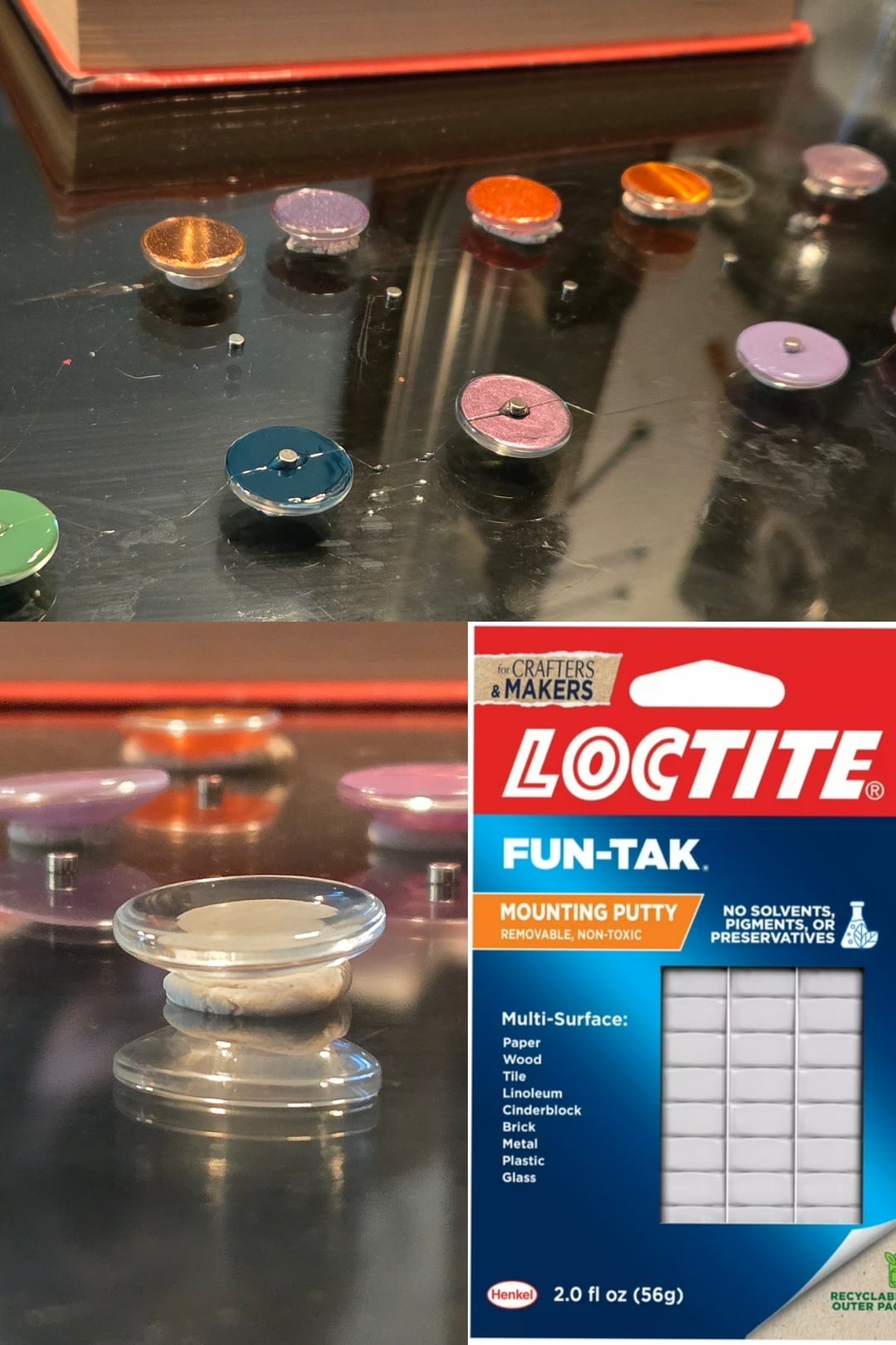 Pin: my biggest problem was finding a way to pick up the tiny magnets and place them in the glue. I needed something that the magnets stuck to, but not stick to so hard that they wouldn't release once I put them in the glue. This took some trial and error but I settled on picking them up with the head of a pin. The plastic head allowed enough separation from the magnet and the metal pin that I could pick it up easily, but also could get it to release and stick in the glue.