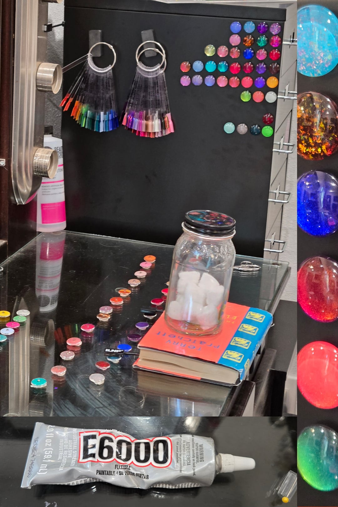 Magnets: I used the teeny tiny neodymium magnets that war gamers use with Warhammer40k. Bigger magnets are fine too, but those tiny magnets are pretty cheap for a lot of them and they hold up the cabochons perfectly. I also like that they're small because I don't worry about them putting any stress on the polish when I pull the cabochons on and off to reorganize them, because they're strong enough to hold the cabochon on easily, but theyre small enough that they pop off easily too. It's the best of both worlds.