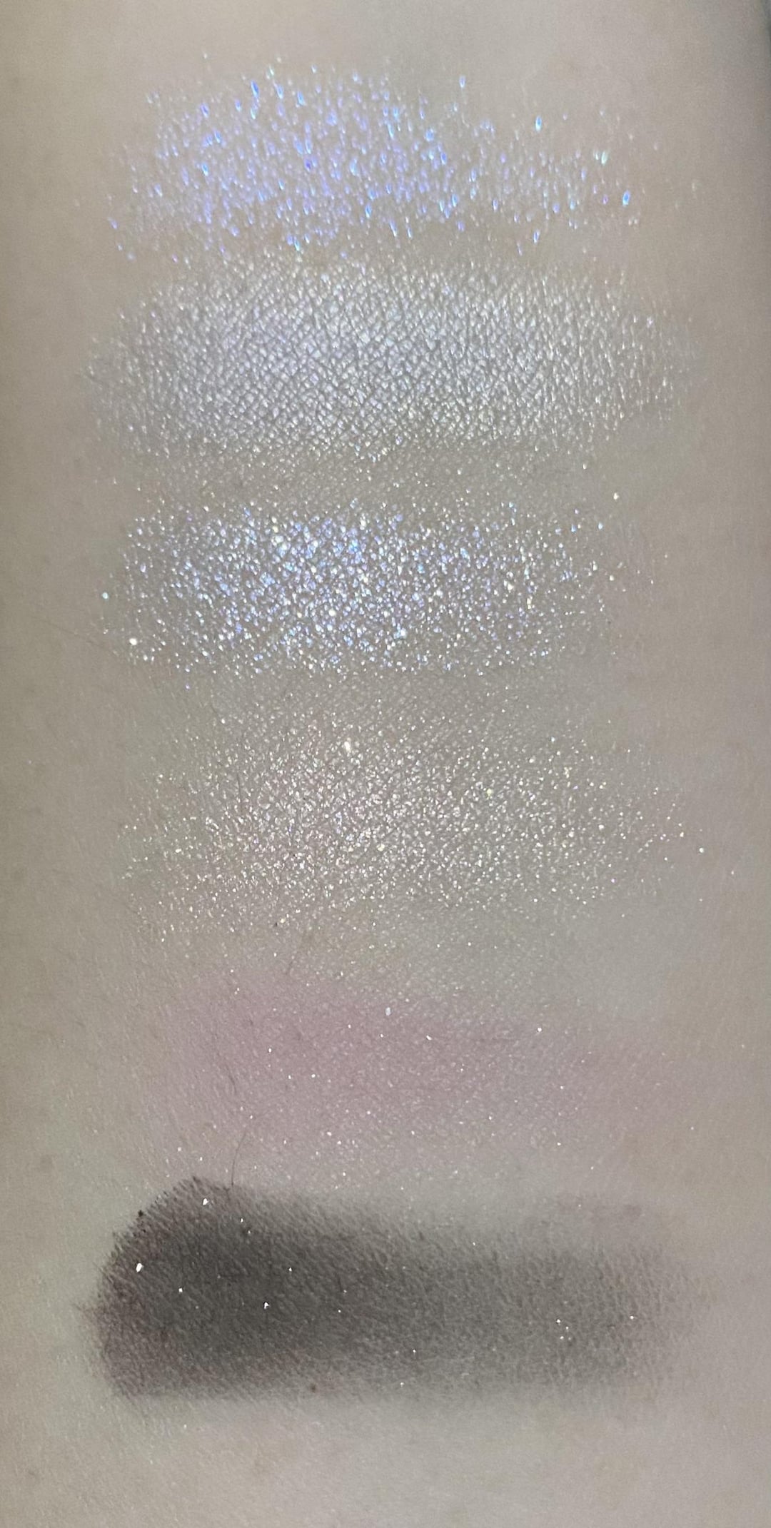 The photos of the matte shades are taken in indoor, indirect sunlight and the photos of the glitter shades are taken in indoor, neutral LED lighting. All photos have been adjusted to reflect how the shades look on me IRL and I use an iPhone 11. Swatches were done using a finger and I had to layer most of them since they’re not particularly pigmented and don’t blend the best (as you can see from the swatches themselves).
