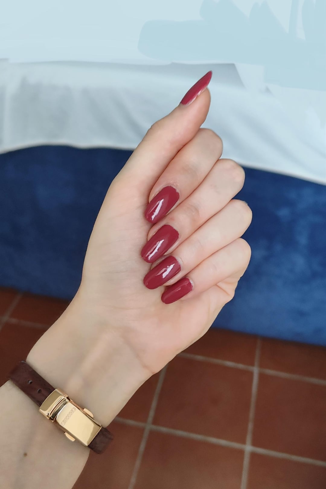 I love that this red has changing hues going from dark pink to some brown depending on the light. It's a gorgeous berry red.