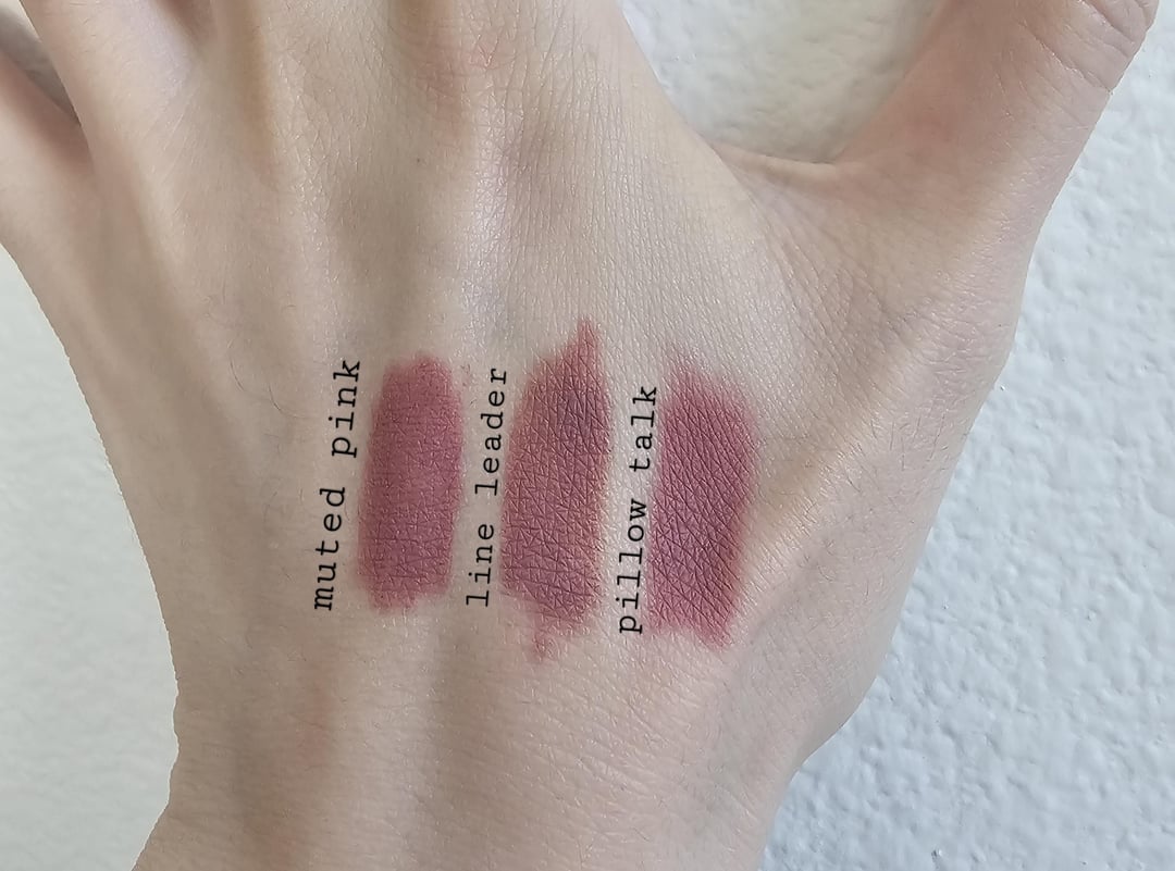 I included swatches on photo 2. I dug out my very old stuh of pillow talk so the swatch of it might be not 100% accurate. The 3 liners are very similar but the Maybelline is the most longwearing. Muted Pink is slightly cooler(can look purple when im tanned). I prefer Line Leader which stays perfectly neutral and not as coral or bright as Pillow Talk.