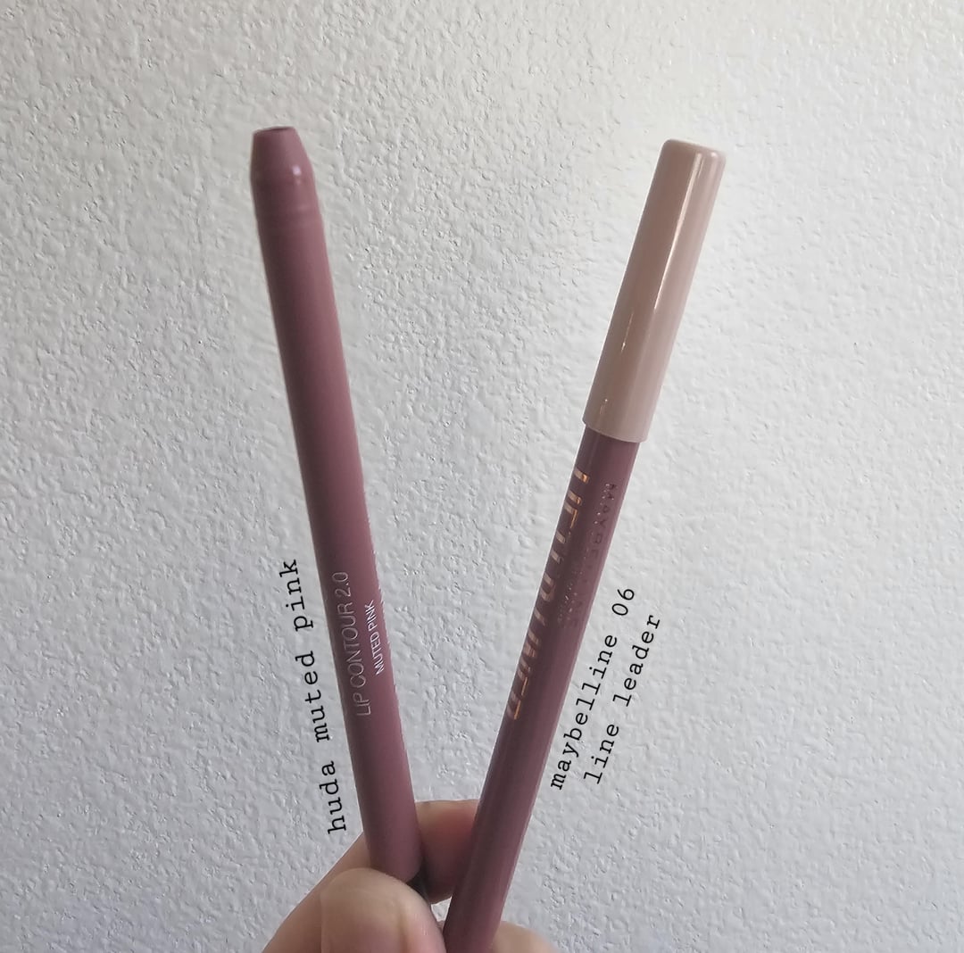 Left is huda beauty lip liner in muted pink and right is the replacement in Maybelline 06 Line Leader