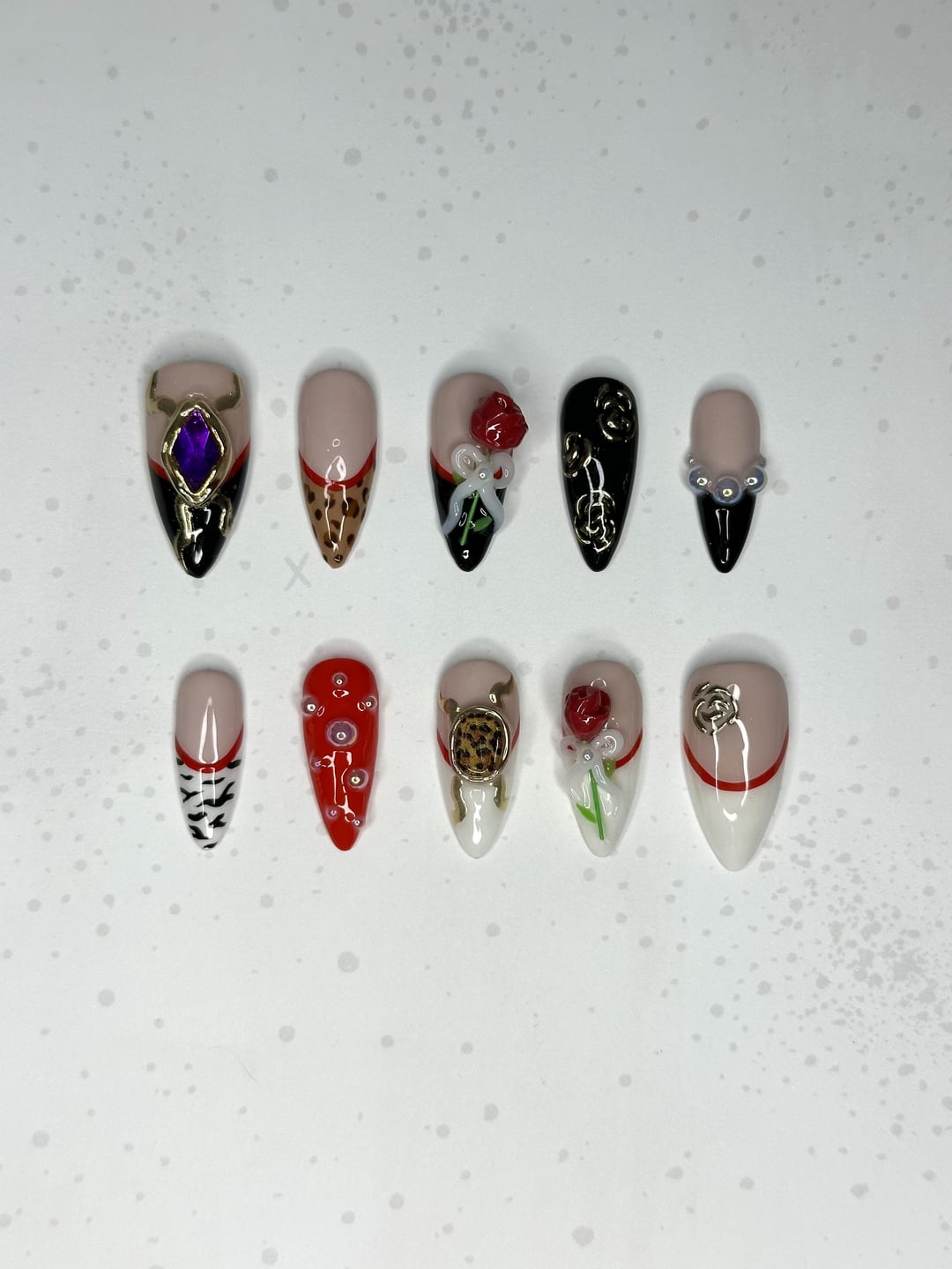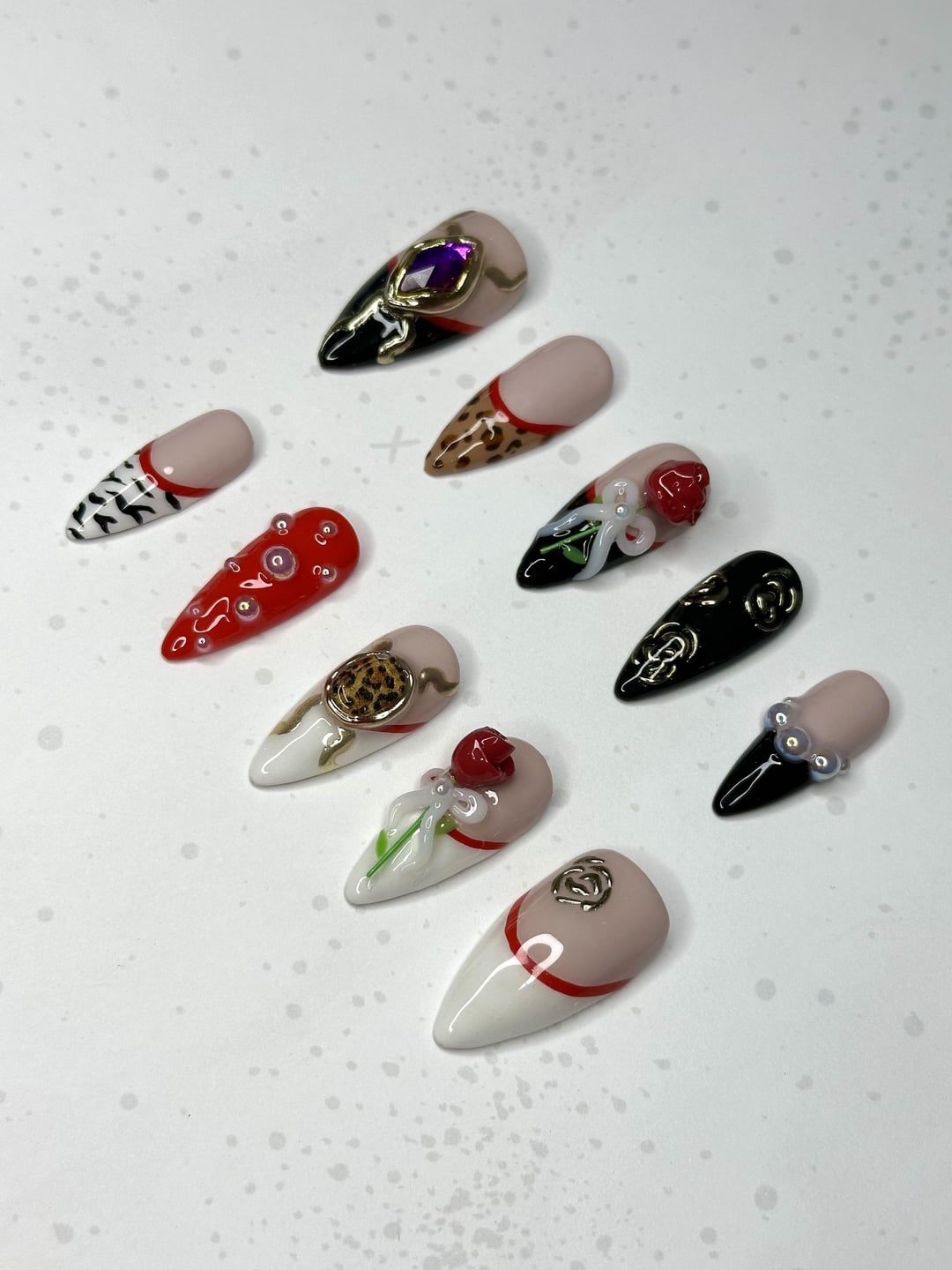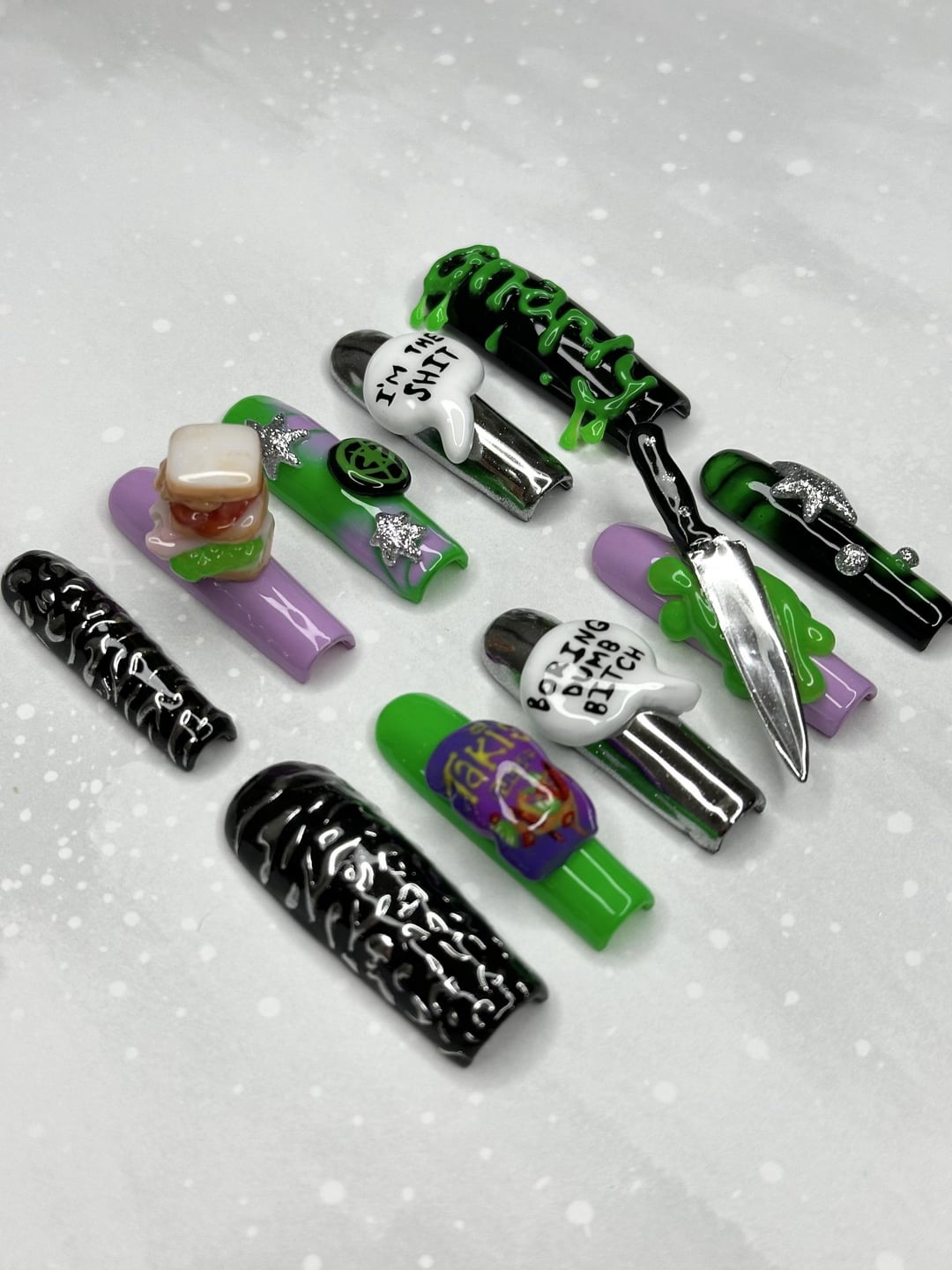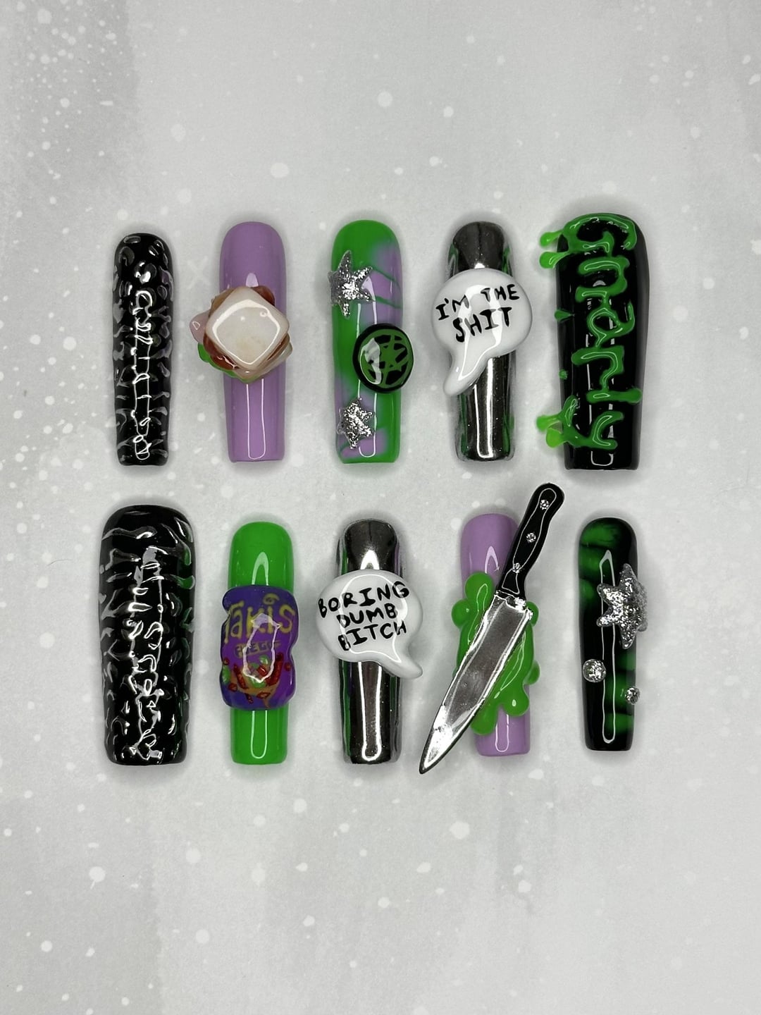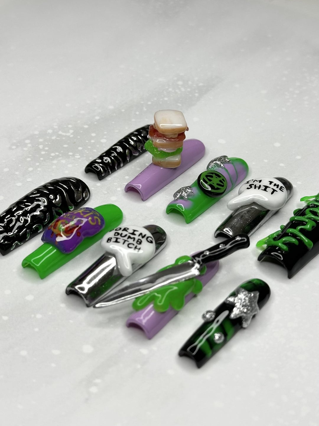 any katseye fans here? i created these press ons inspired by their gnarly, gabriela, and gameboy music videos 💅🏻 everything is hand painted and sculpted with some help from the 3D printer on the knife and game controllers by DramaticTip2155