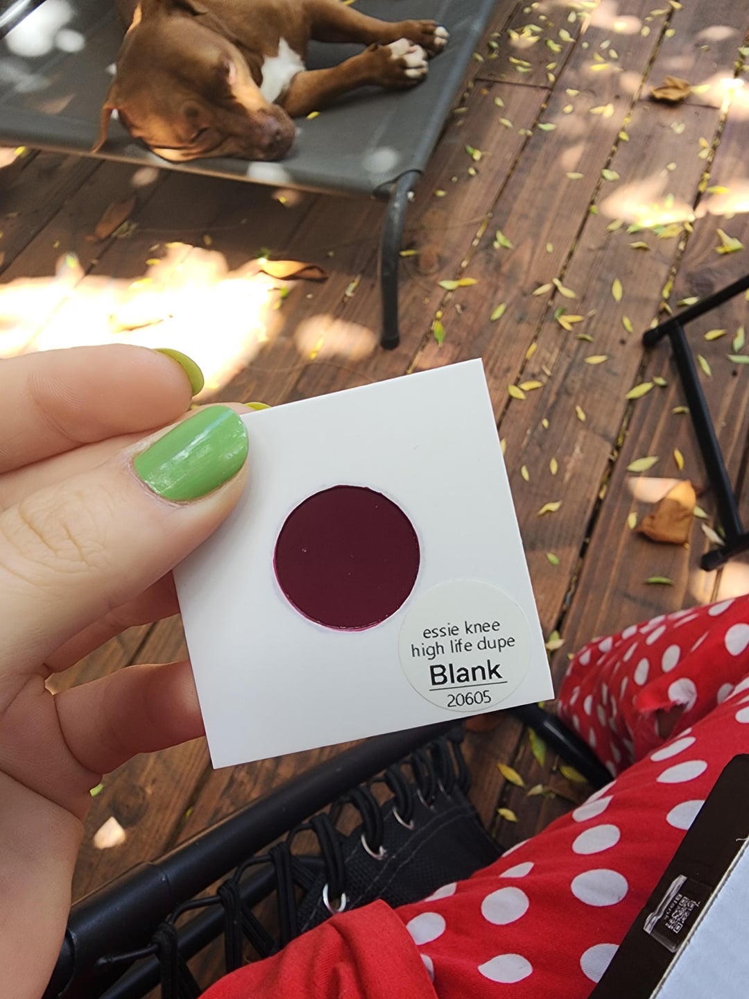 Pics 6-11: My custom color, meant to dupe Essie's "Knee High Life" polish since mine is old and I don't love the thin applicator anyway. I attached the photo I used to get the custom color, and although my camera was pretty determined to not pick up the colors of the polishes accurately, I can say that the polish I got was VERY accurate to the color I provided. They also provided a cute little swatch of the custom one. It is not as bright as the Essie polish, which I think is partially due to user error and the color I gave them, since Zombie Zest was also not as bright as it seemed online it may just have something to do with their colors as a whole. You can most easily see the difference in the 11th photo. However, I am still VERY happy with the color I got, especially for the quantity and price which I'll mention at the end. For me, this color match was accurate enough that I am happy, and I also do believe that the color I sent them to replicate wasn't the most accurate representation of the polish. Please ignore the messy polishing, it was quick and my old Essie is NOT smooth to apply 😭