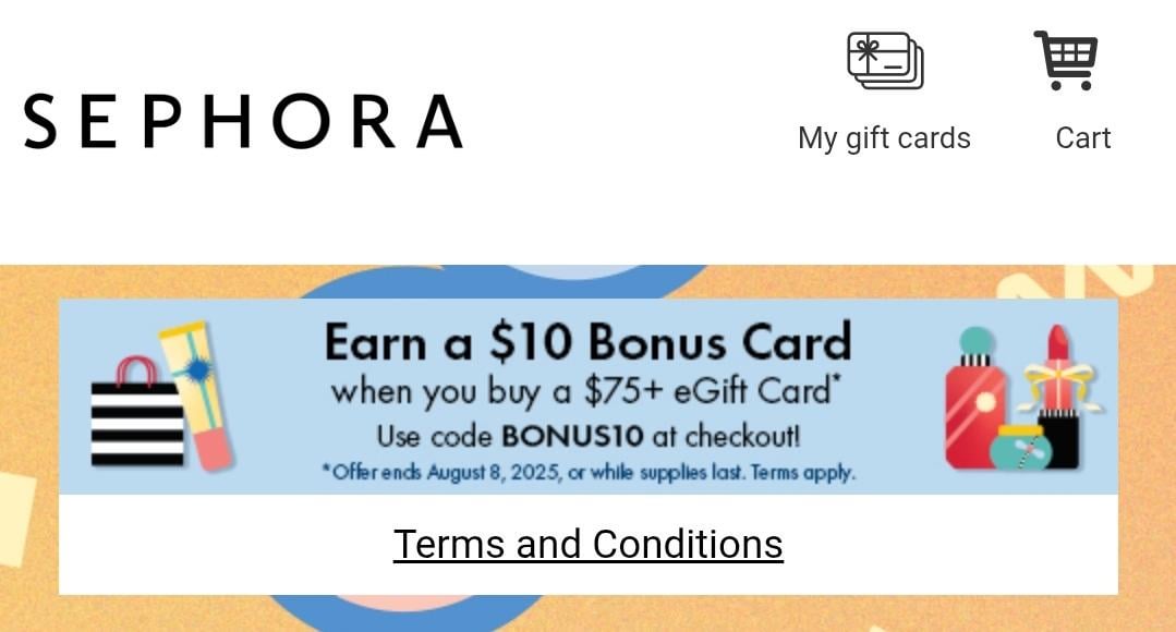 Offer valid for U.S. residents, 18 or older. Between August 5, 2025 at 12:00am PST and August 7, 2025 at 11:59PM PST or while supplies of bonus cards last, whichever is sooner (“Offer Period”), purchase $75 or more in Sephora gift cards (before tax and other fees) at https://sephora.cashstar.com during the Offer Period and receive a $10 Sephora e-bonus card (“Card”).