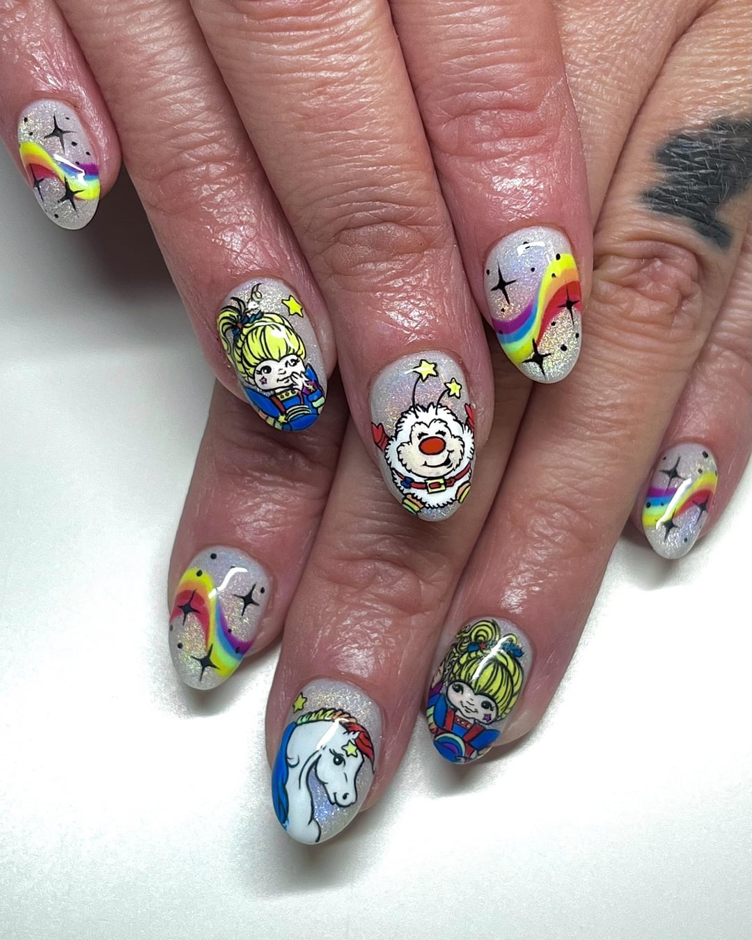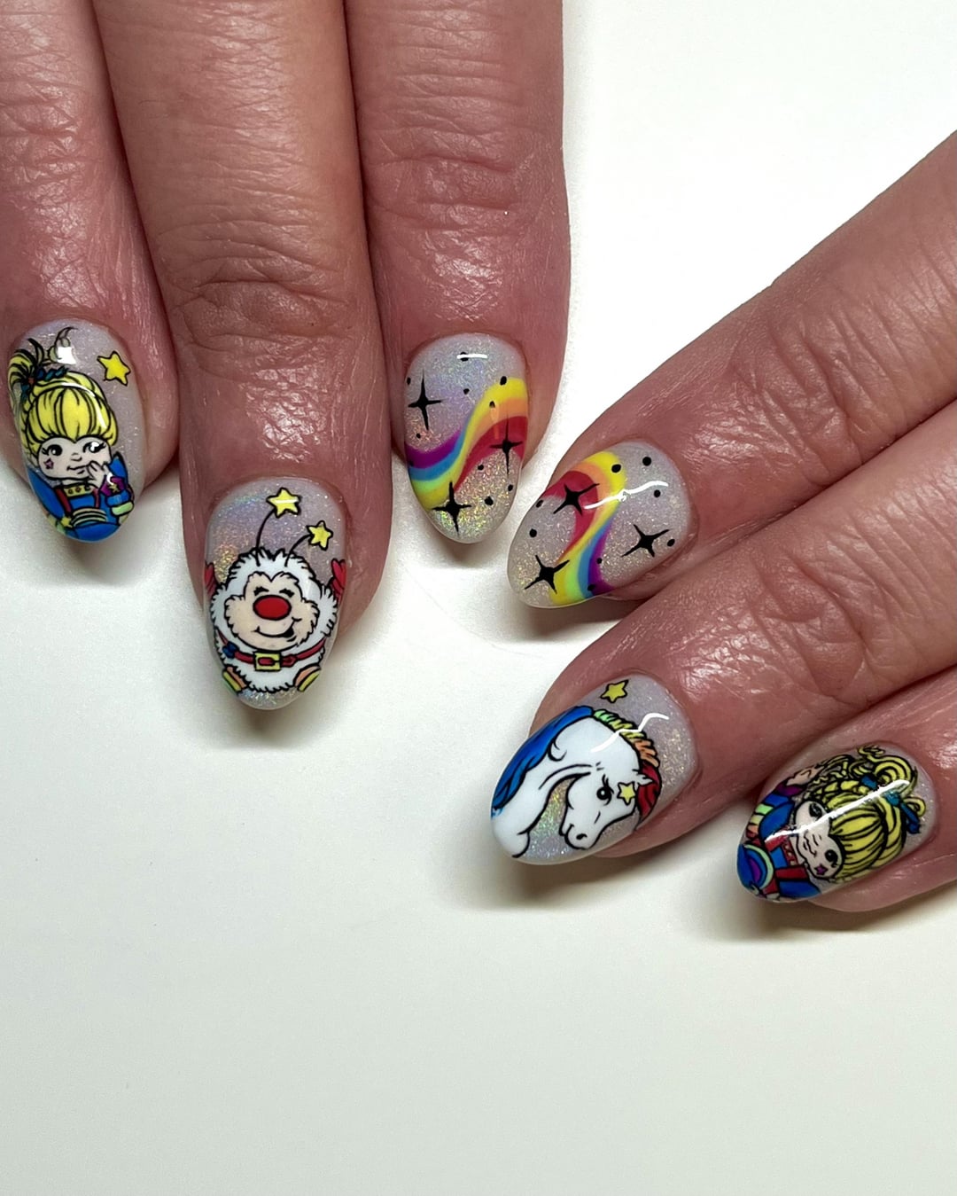 Who else loves Rainbow Brite? 🌈🦄 This has to be one of the coolest nail sets I’ve ever done! They took me a whole day to complete, my client is a saint for sitting with me the entire time! 😅 I used rainbow holographic cateye gel over a milky white base and the rest is completely free-handed! 😊