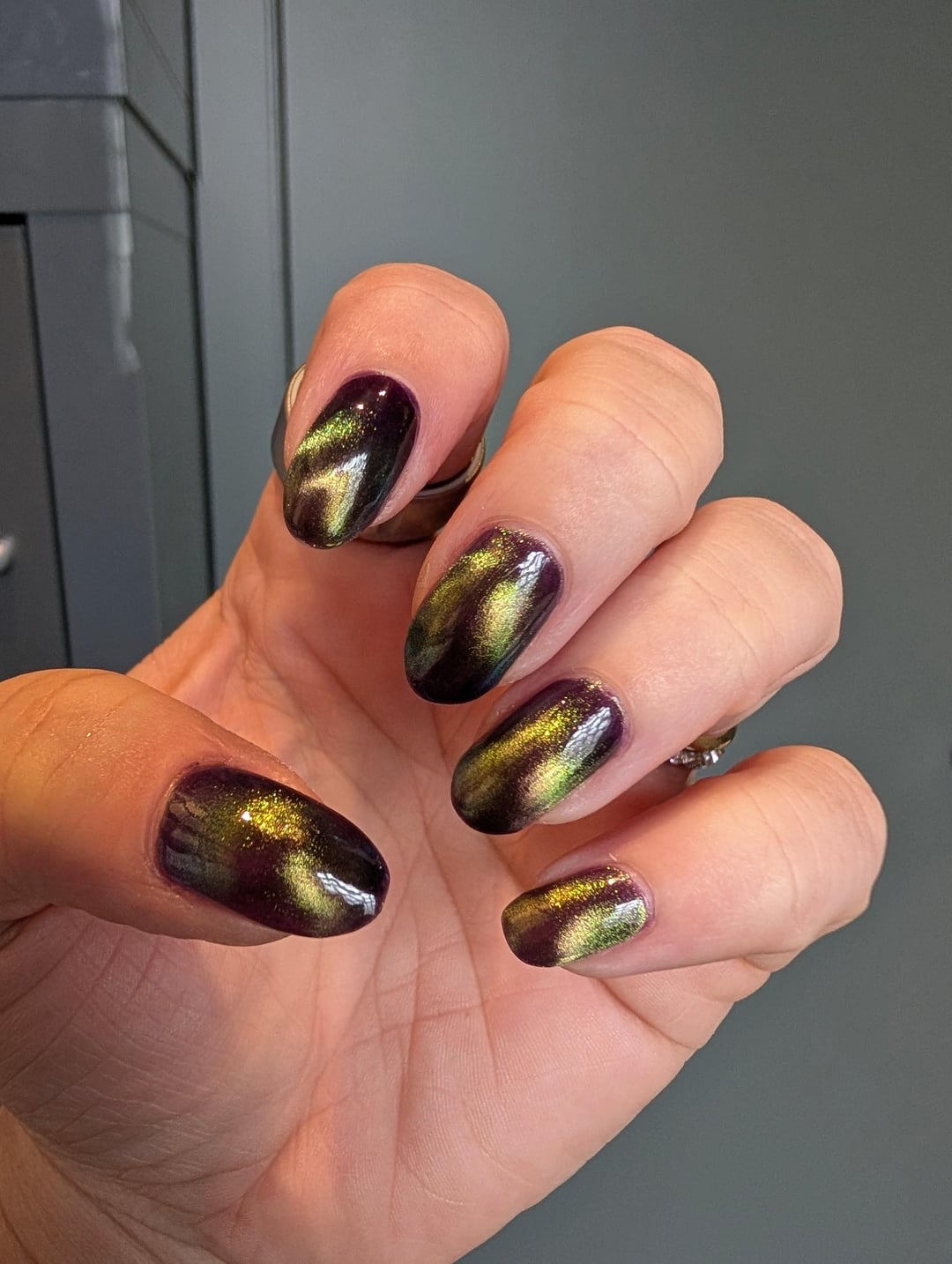 Two coats I Put the Omen in Women, from Bees Knees Lacquer, magnetized as lazy Glass Bead over a magnetic stirrer (so a bit diffuse for glass bead).