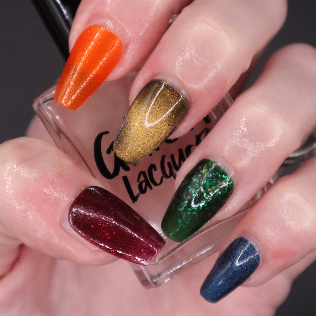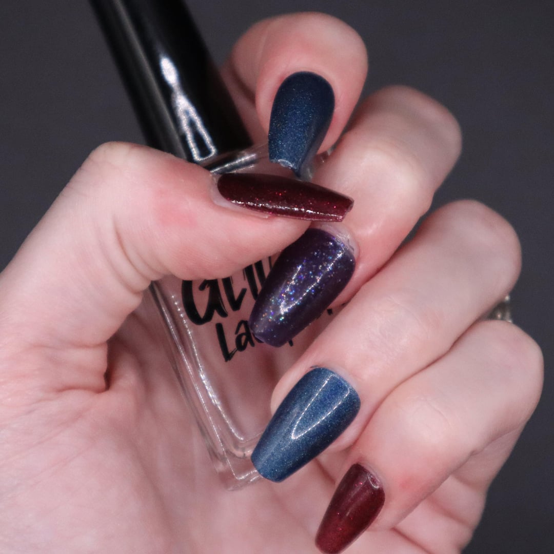 Glitch is launching with 7 shades – a rich jewel toned rainbow collection in a variety of finishes (plus a reflective rainbow glitter topper!) The set ranges from $13.50 for more "basic" glitters and $14.00 for flakies and magnetics. Future launches with straight jellies/crellies/cremes will be $13.00. They're 15mL, 10-free, cruelty free, and vegan! All of the polishes in this collection were swatched with two coats. Shadow Ruby, Alexandrite Prism, and Mystic Quartz do have some noticeable texture from the glitter, but nothing a glitter grabber can't fix. Bloodstone does feel a bit thicker due to the flakes. This entire collection is swatched on my hands, but I do have swatchers lined up for future collections!
