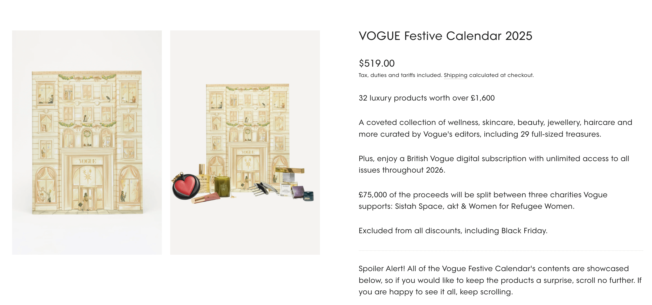 Vogue Festive Advent Calendar 2025 now available ($519 + $40 U.S. shipping, advertised value $2,100+) by spyrenx