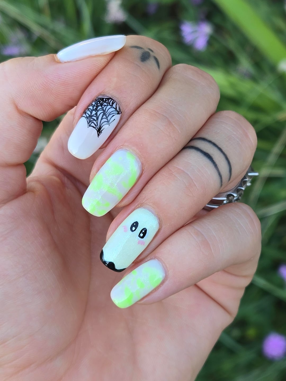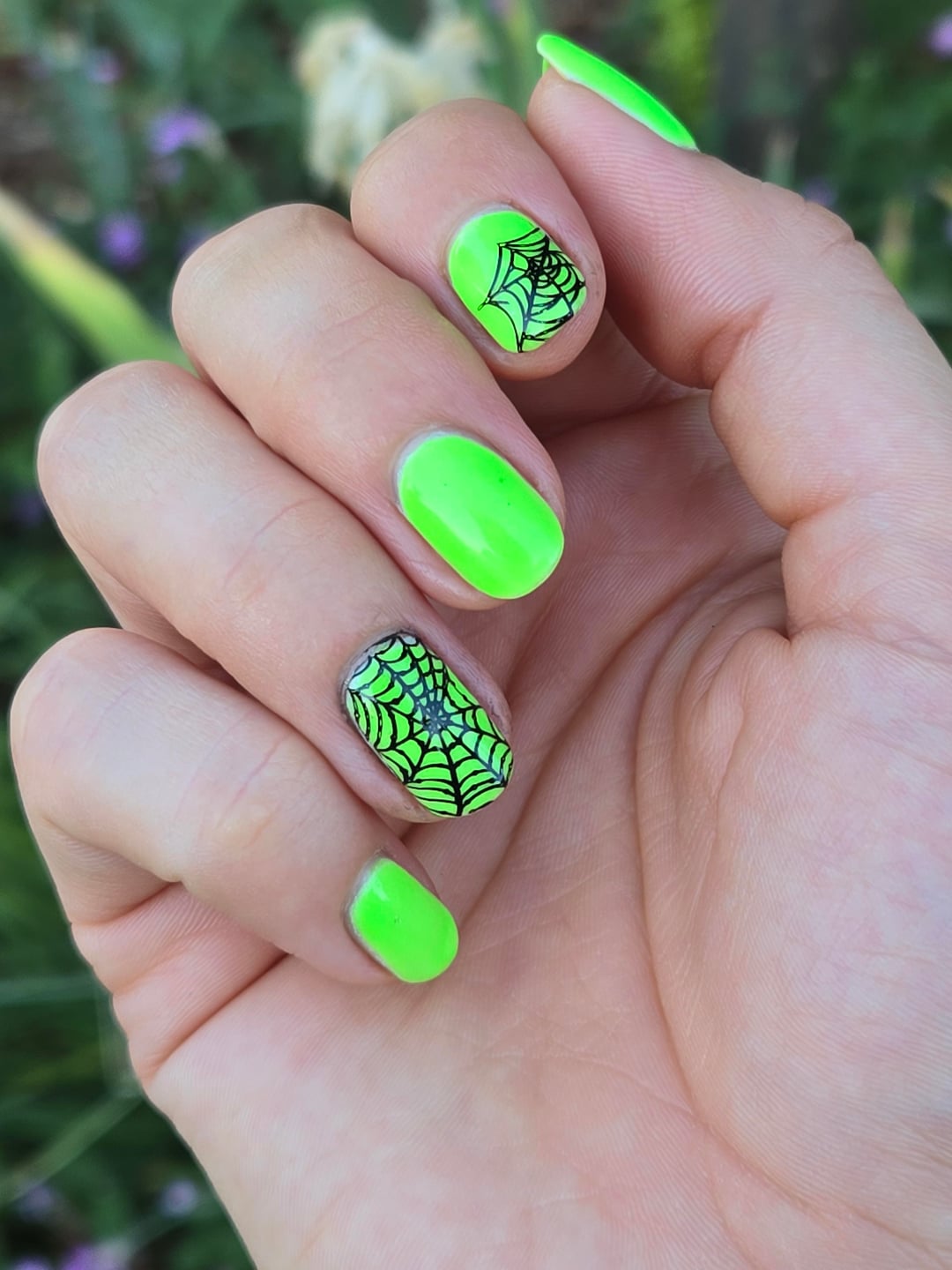 Image 4-5: Mooncat underneath 2 coats of Night Owl Lacquer's Killer Kiwi, in the daylight and in the dark, not charged with UV.