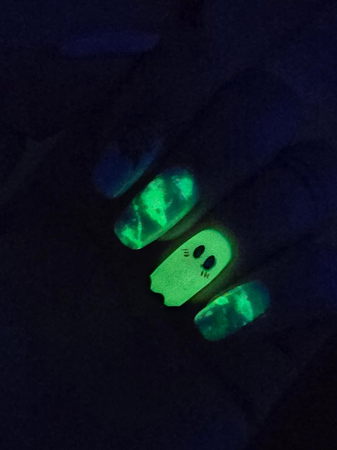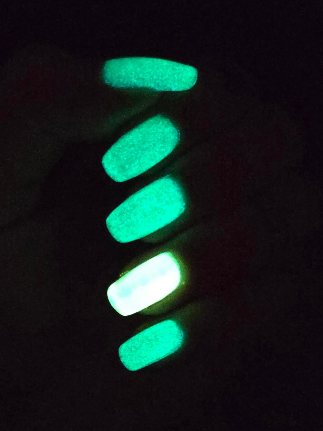 Image 6-7: Mooncat on ring finger and splattered on middle and pinky, in daylight and in the dark, not charged by UV light.