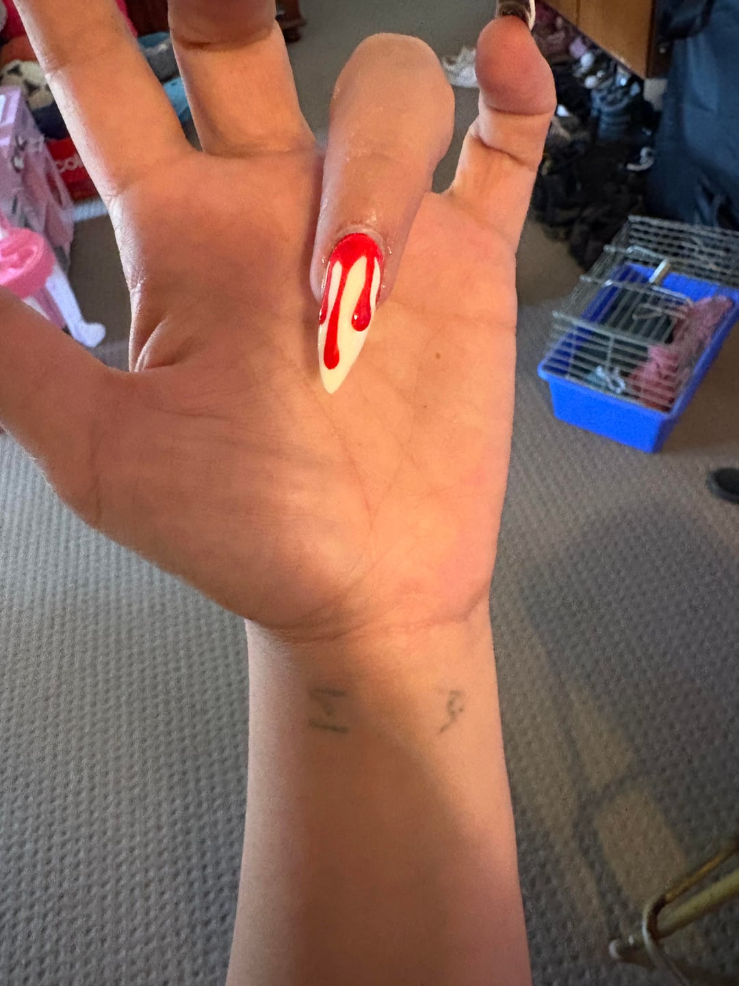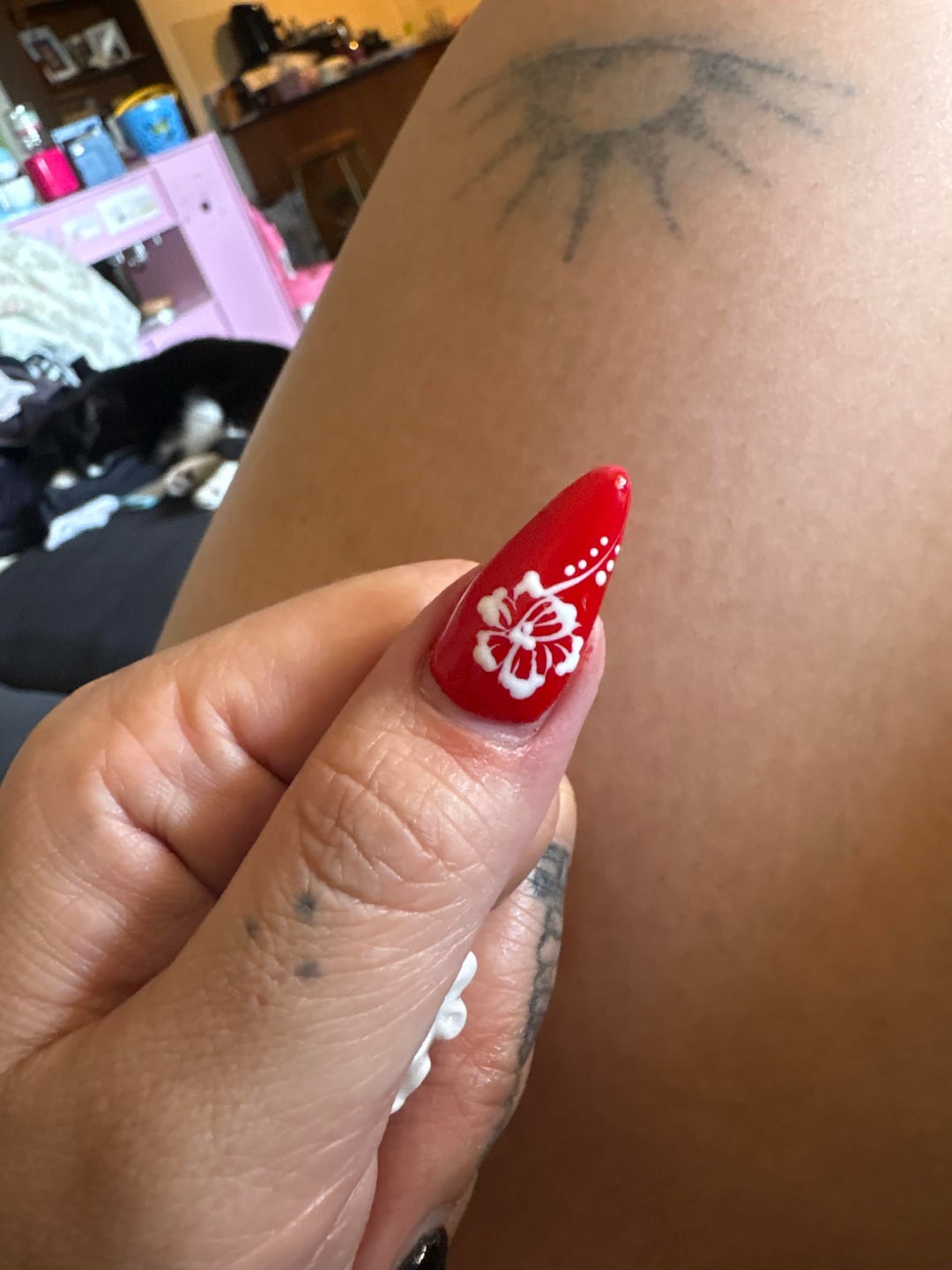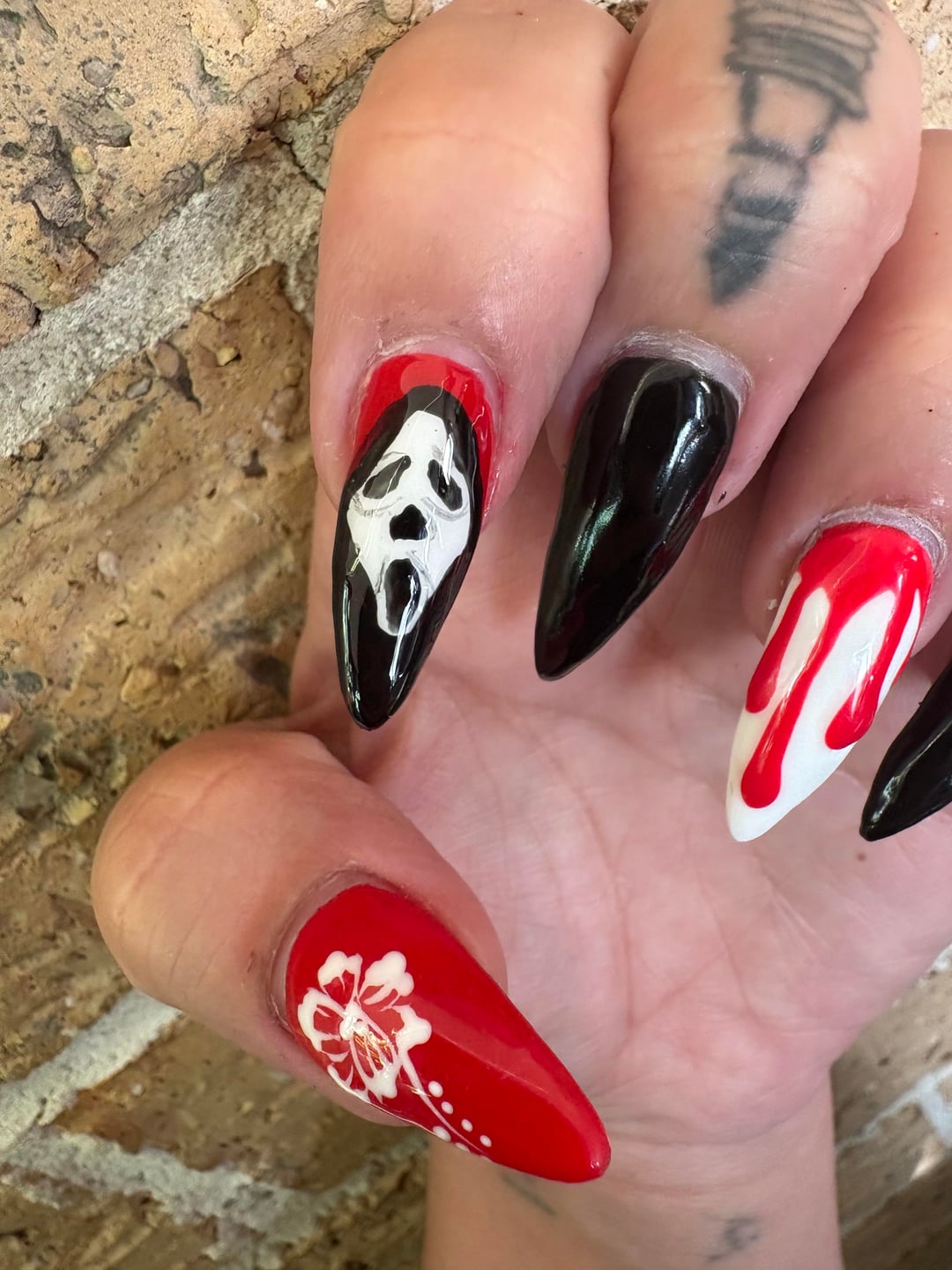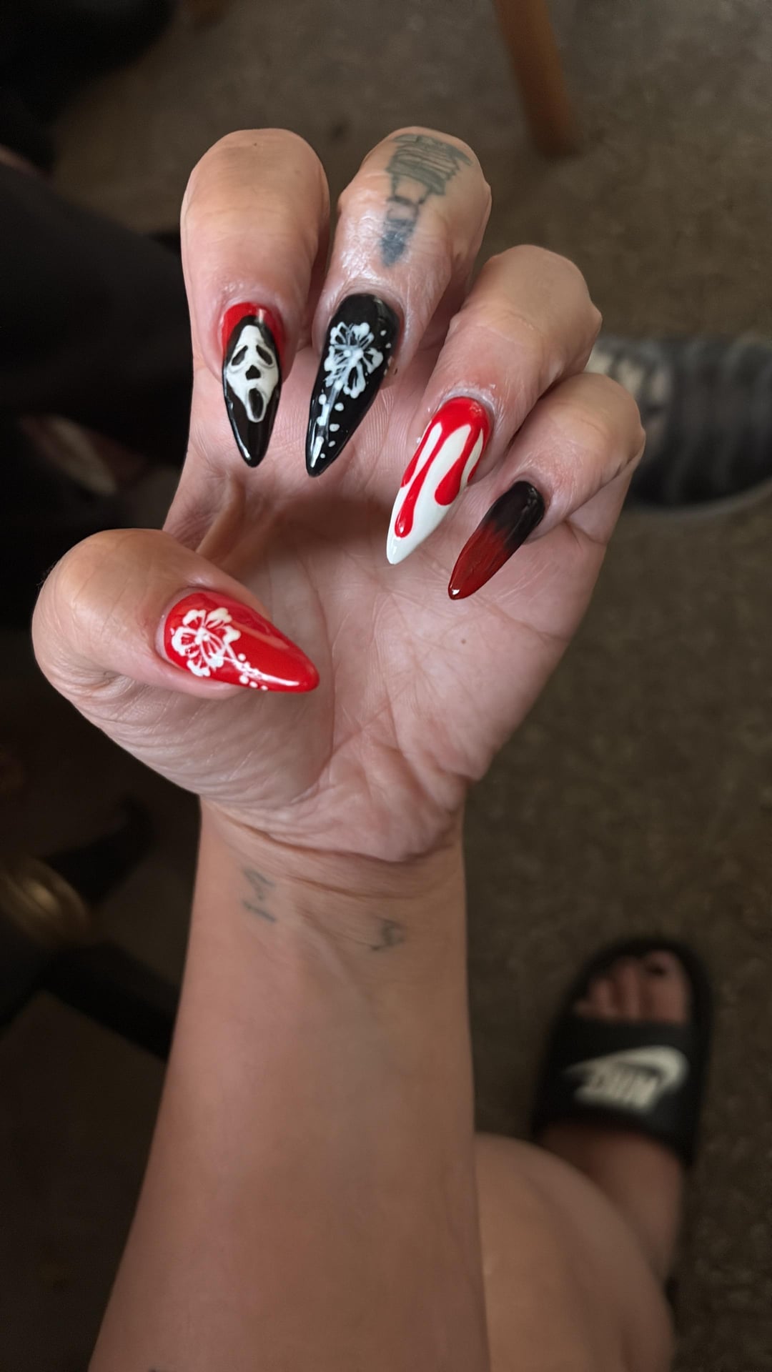 First attempt at nail art like this PLEASE tell me what yall think! I know the flowers don’t match the spooky theme but I wanted to practice them too! by HighxTide69