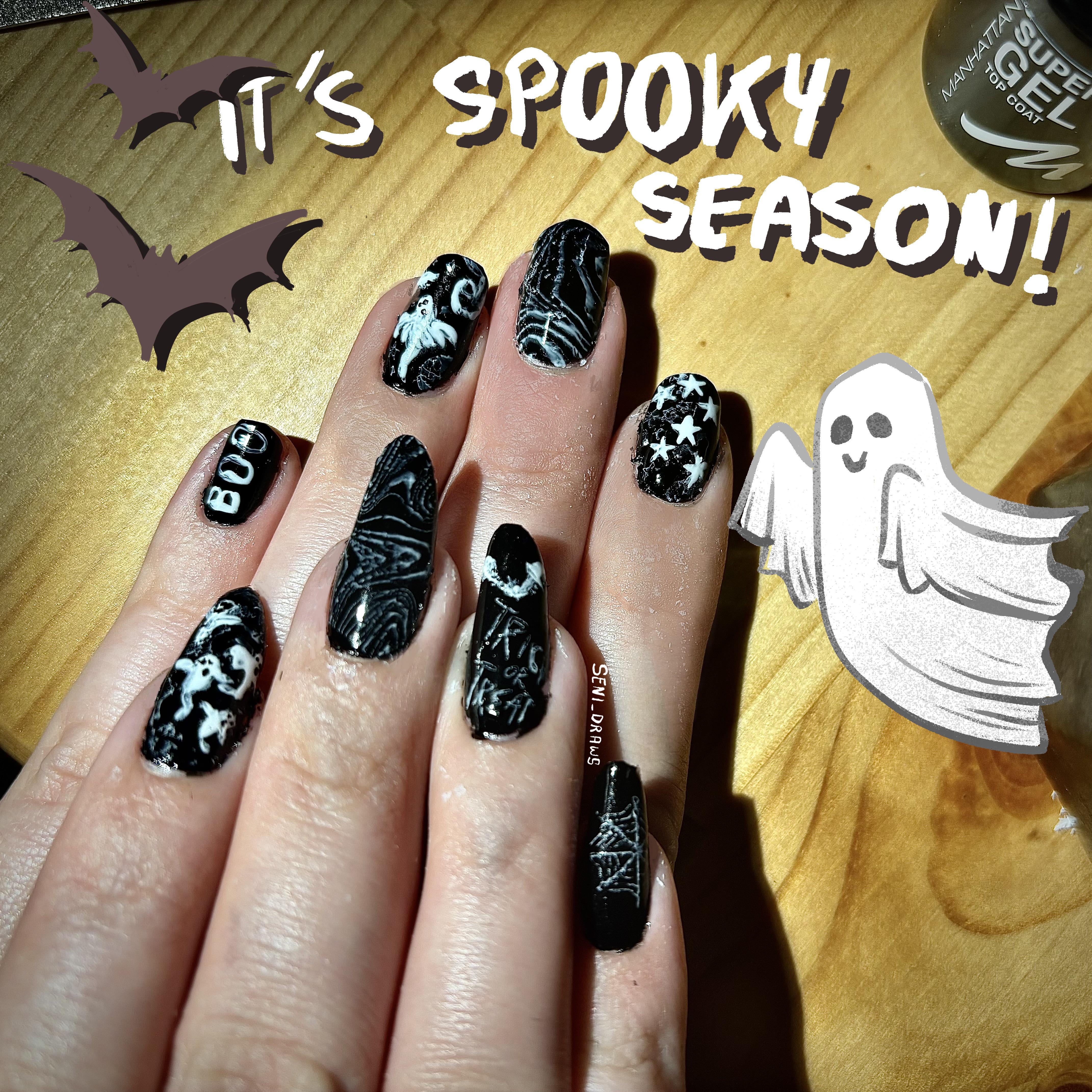Products Used: KUDAN water-based nail polish: N. 02 (Black) and N. 03 (white). Manhattan cosmetics: Super gel top coat (clear glossy, not actually gel) Stamping Tray: SHOY plus 034, Arte Clavo Halloween stamping trays (01, 02, 03) by Seni_draws