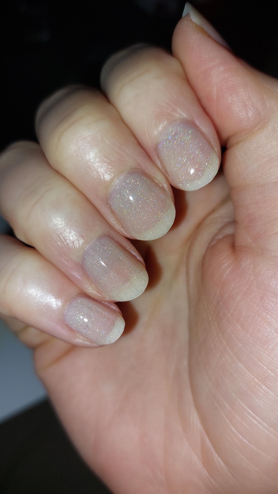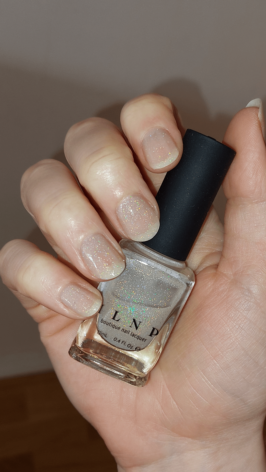 Two coats of Elle by ILNP. Looked way too grey in the bottle but perfect on the nails, and the scattered holo just… 🥰