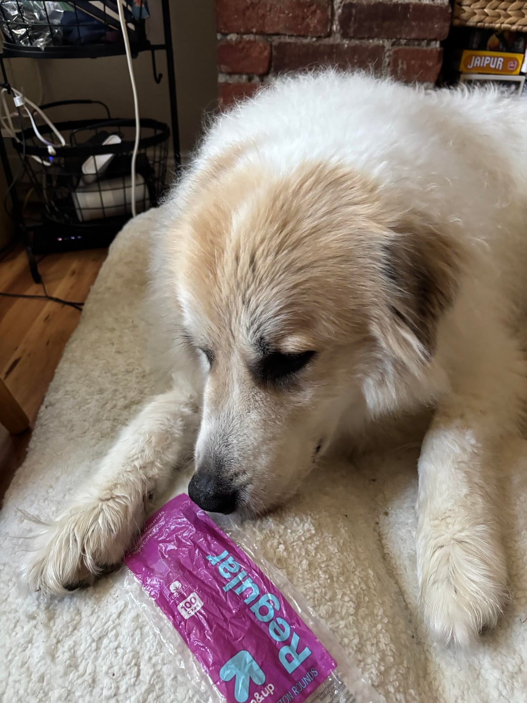 Kona had a sPaw day today. She finished a roll of cotton rounds (for ear cleaning) and a bottle of detangling spray. Current panning project is nose balm! Sometimes, her sister Paloma borrows a couple cotton rounds for her airplane ears.