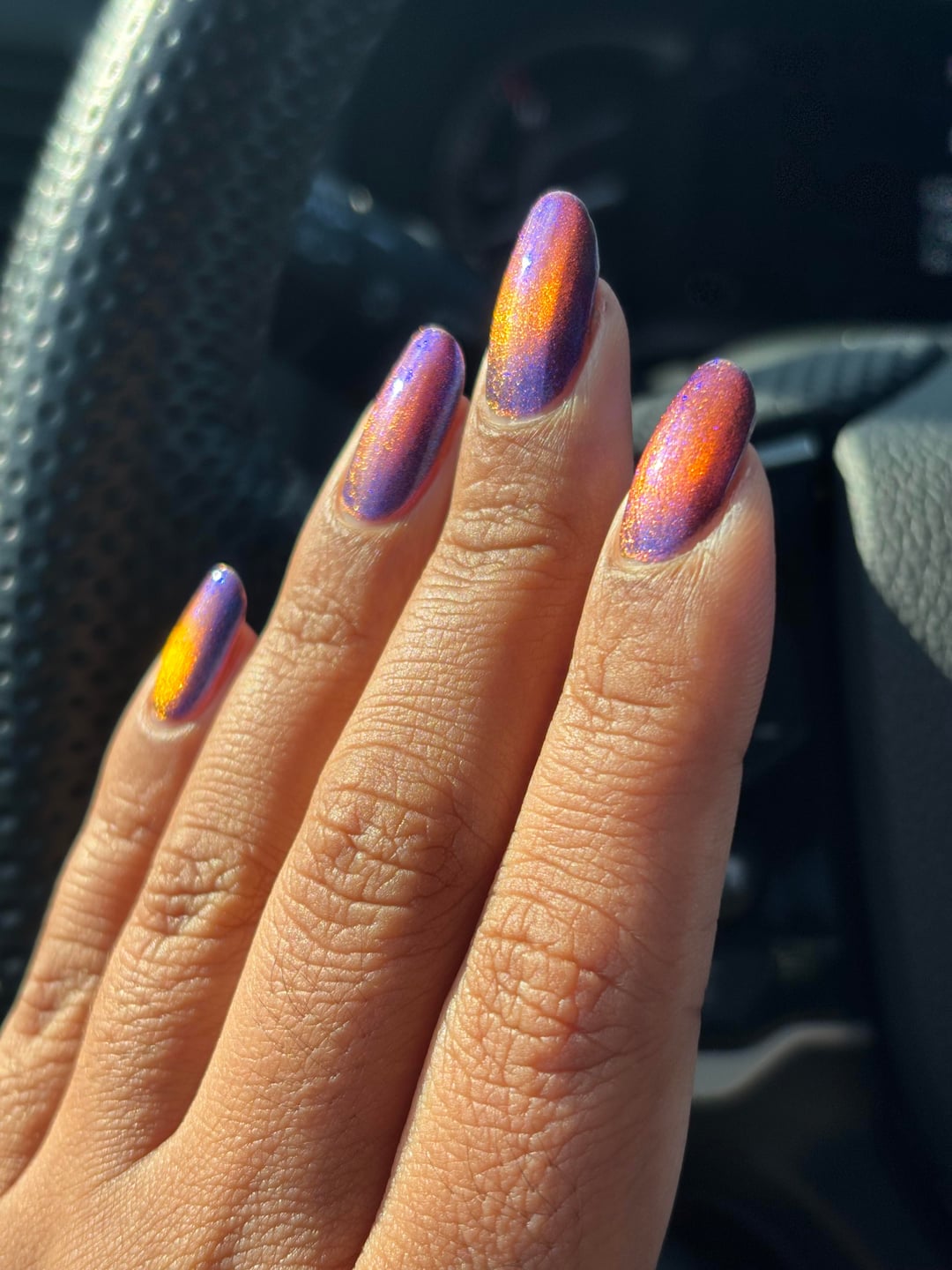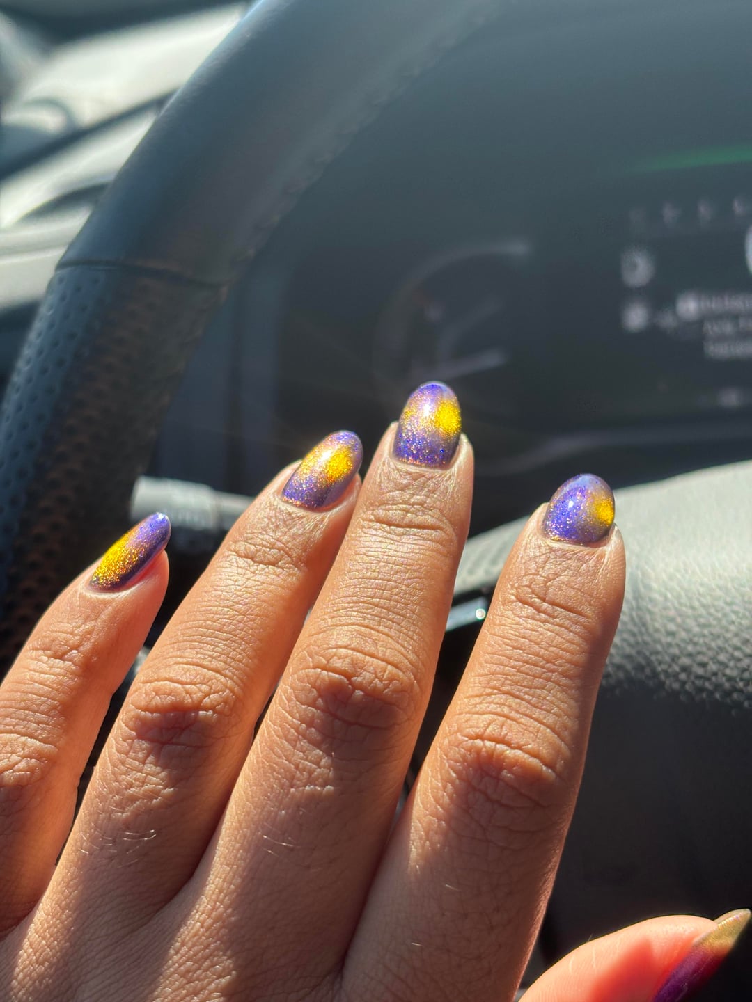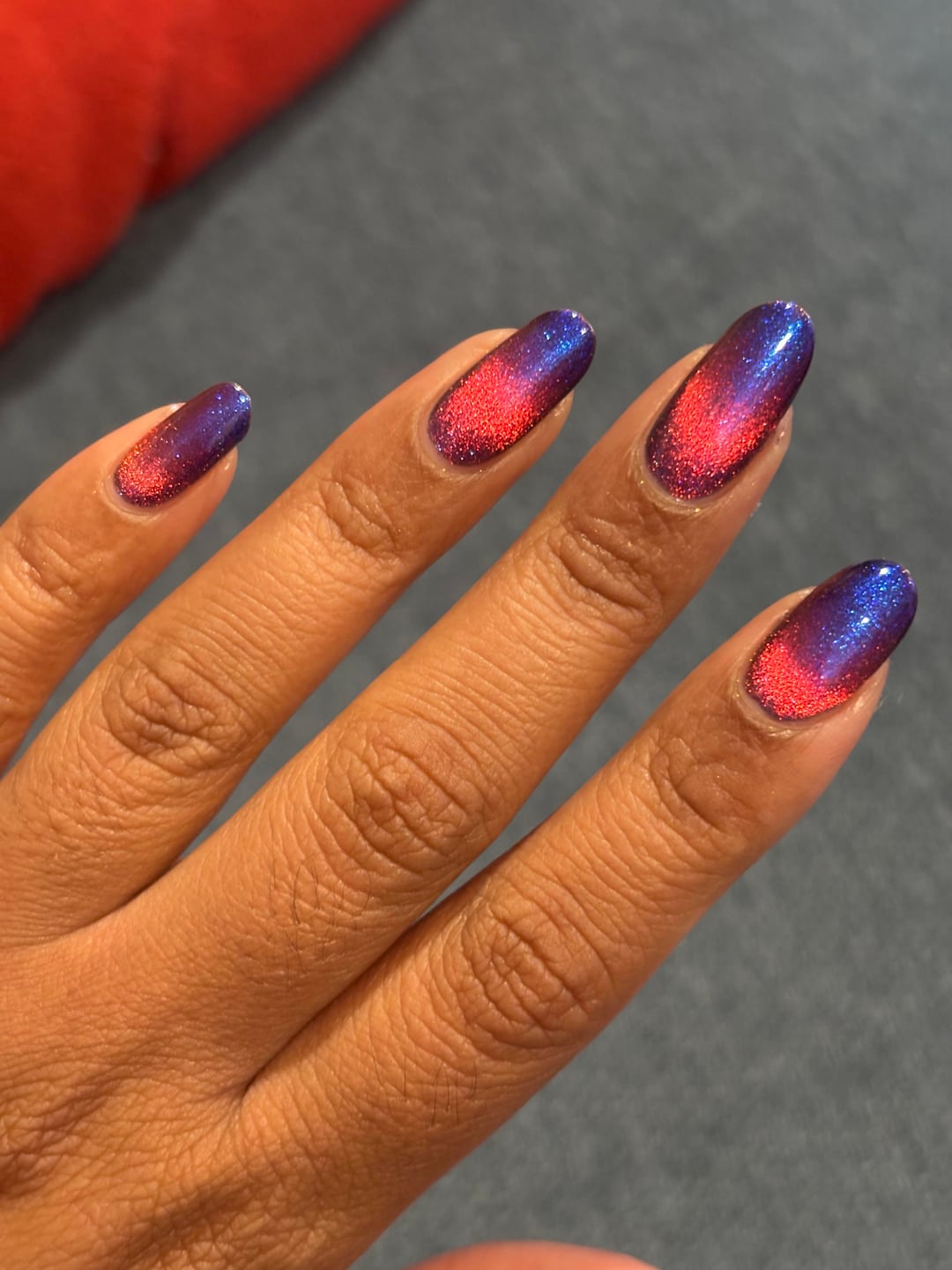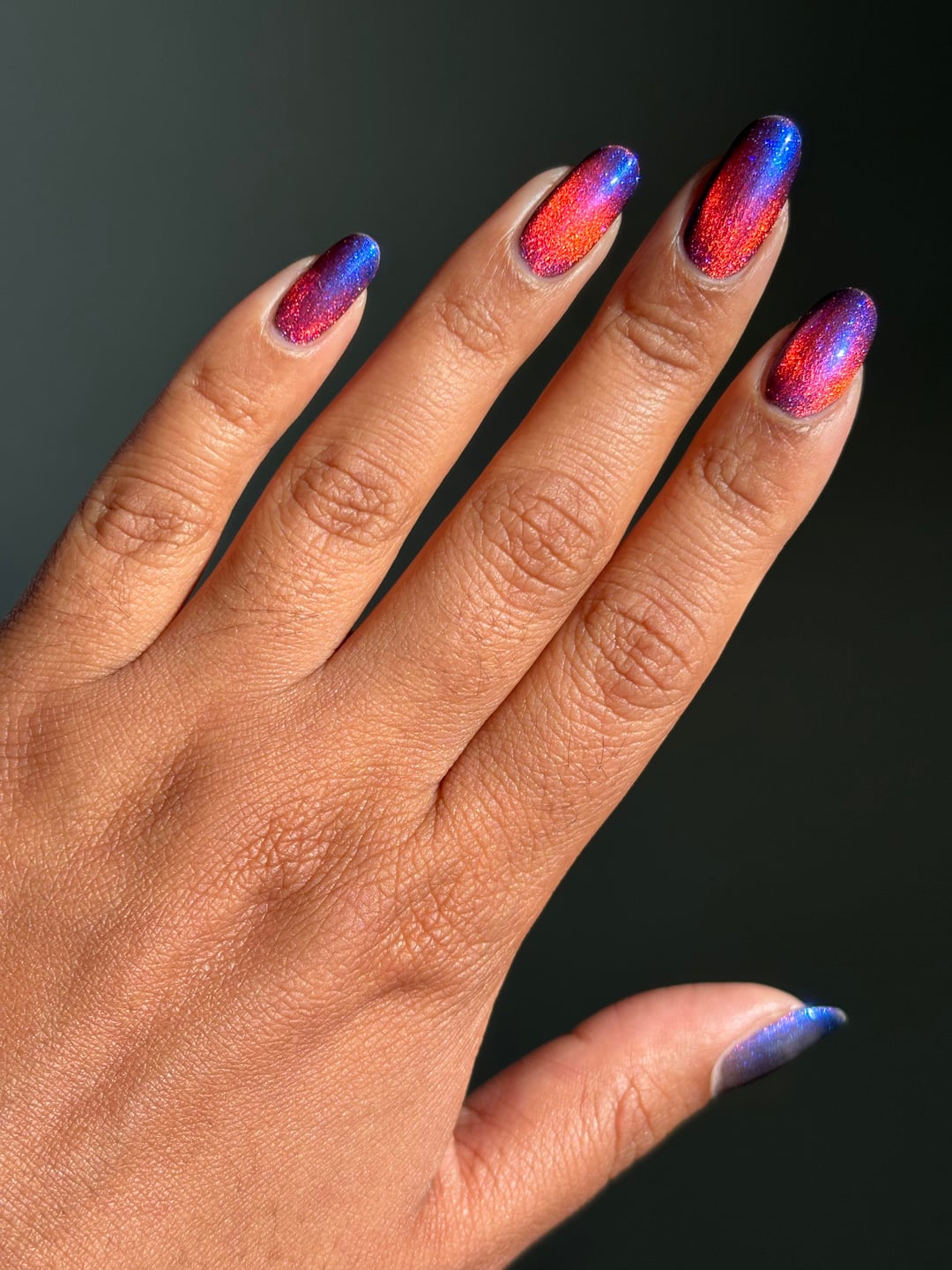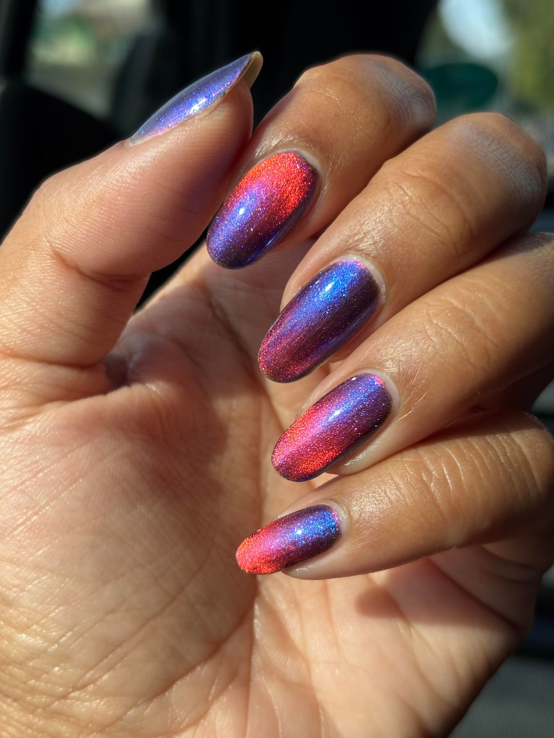 Magnetized using the glass bead method. This polish is lovely but so sheer – even after three relatively thick coats you can see my nail line – it’s most obvious on my thumb in the first and fourth picture.