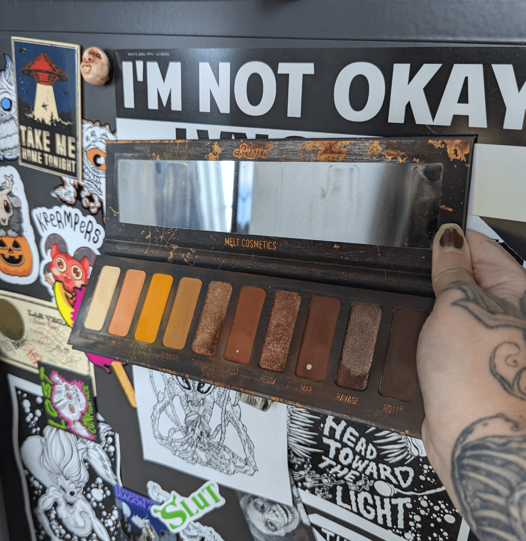 Melt Rust palette. New pan in her namesake, Rust. I use this baby to make smokey, messy, grunge eye looks I love to pair with bleach brows and either a dark brown lip, or a super pale flesh tone lip. The look I did with it today was a dark brown lip, and I finally got around to actually bleaching my brows so the bleach pomade doesn't look as ridiculous lol.