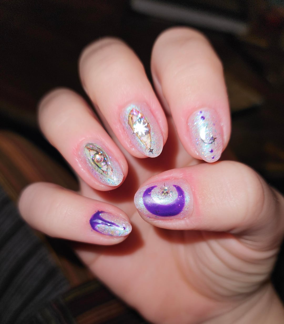 I'm a beginner at gel nails and wanted to incorporate multimedia & texture. I had some magazine eyes cut out for a collage piece and this look was born. by Active-Smile4576