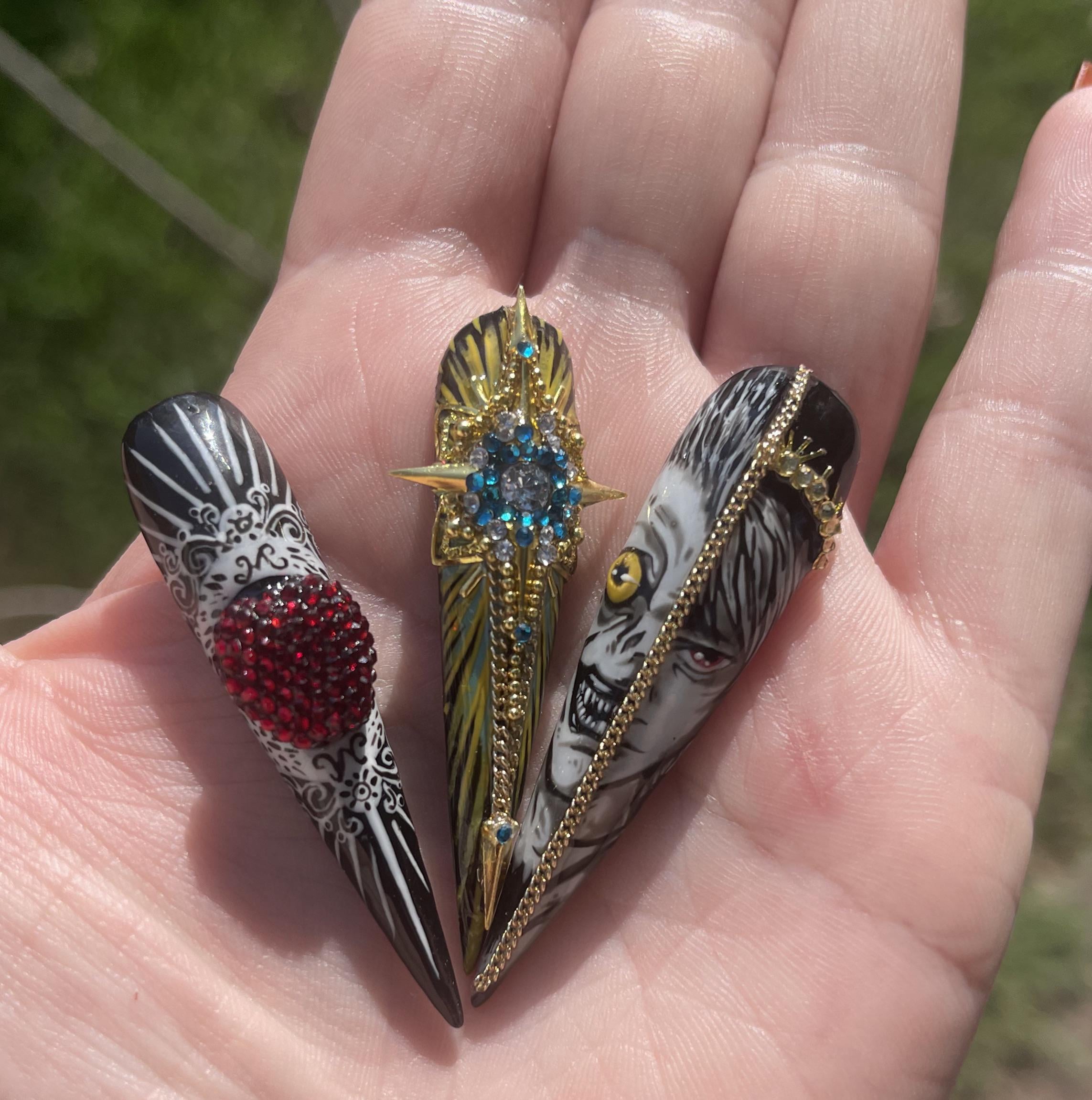 Y’all, I’m tired. I’ve only done this many…I don’t even have the other nails shaped. I keep losing all the gold embellishments I cut and so now I gotta struggle to cut more tiny pieces. by Glittering_Price2770