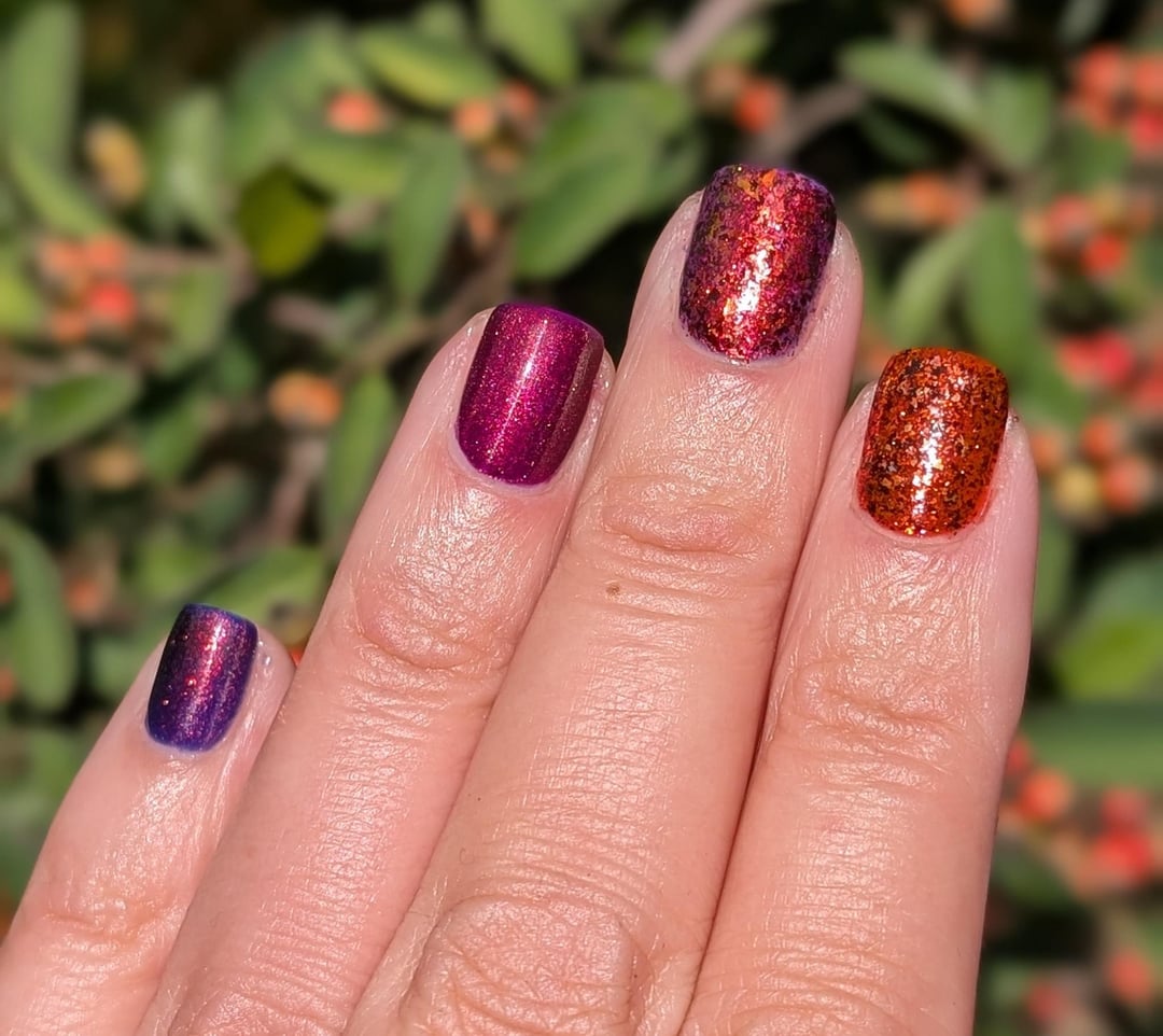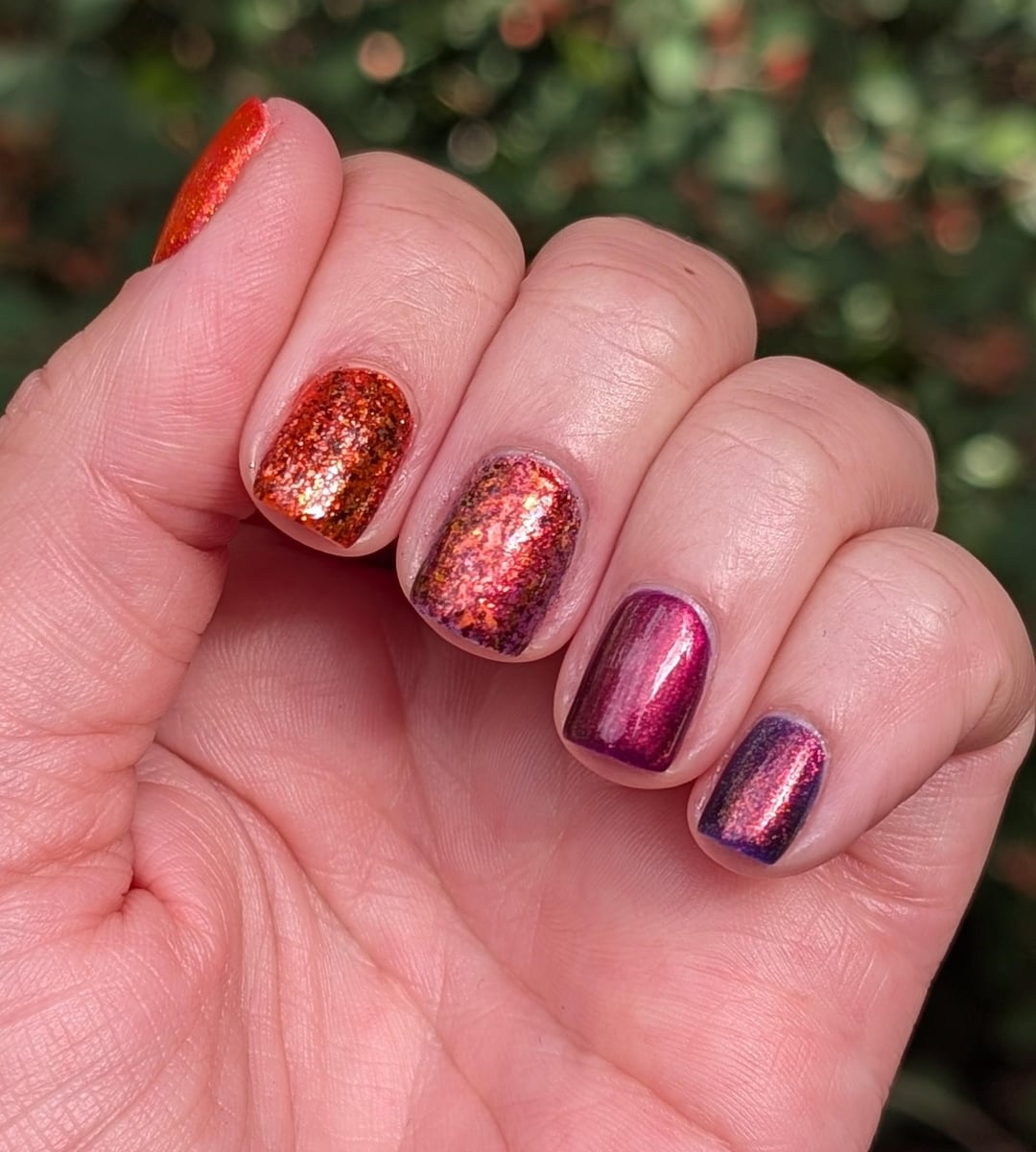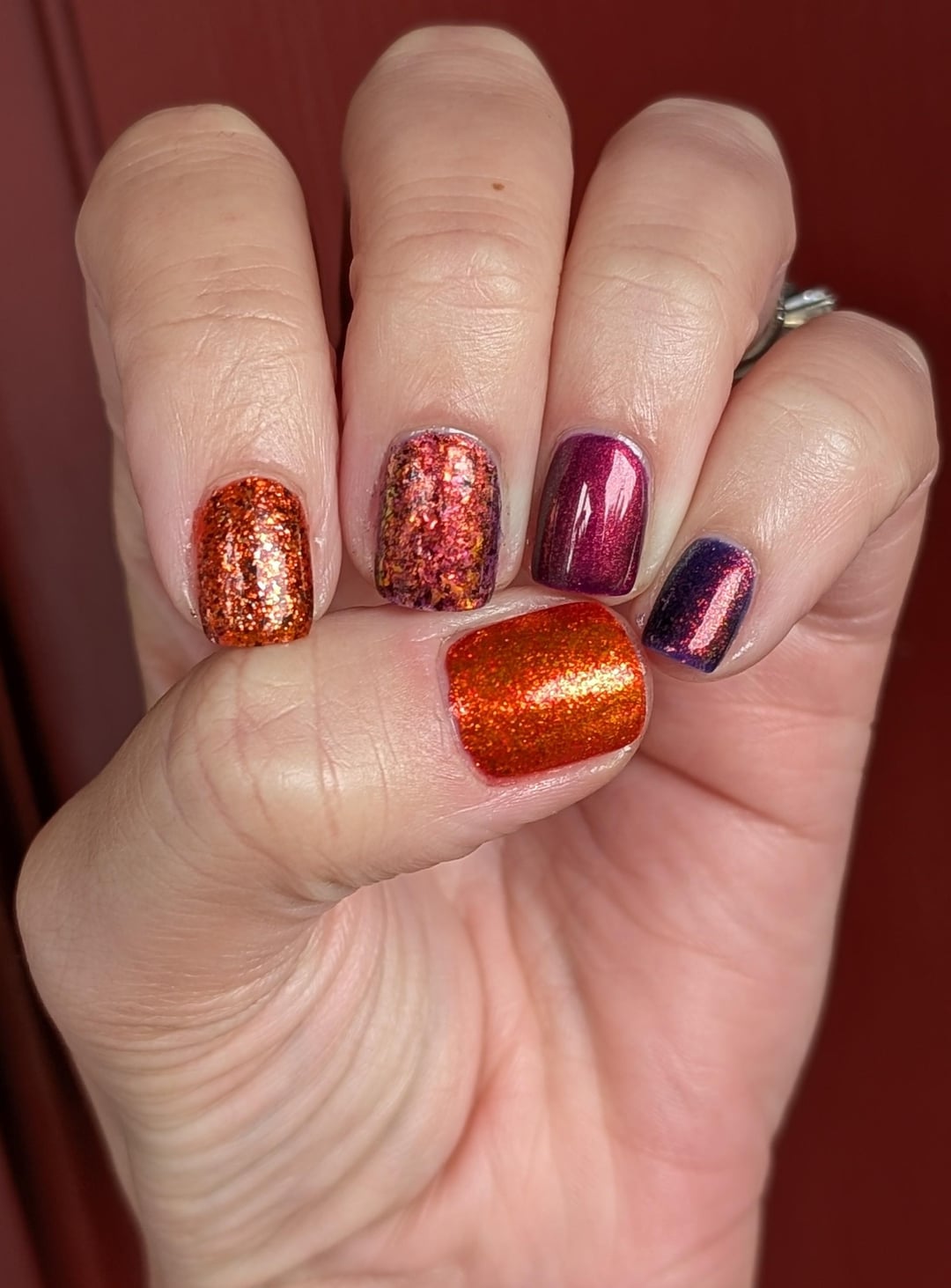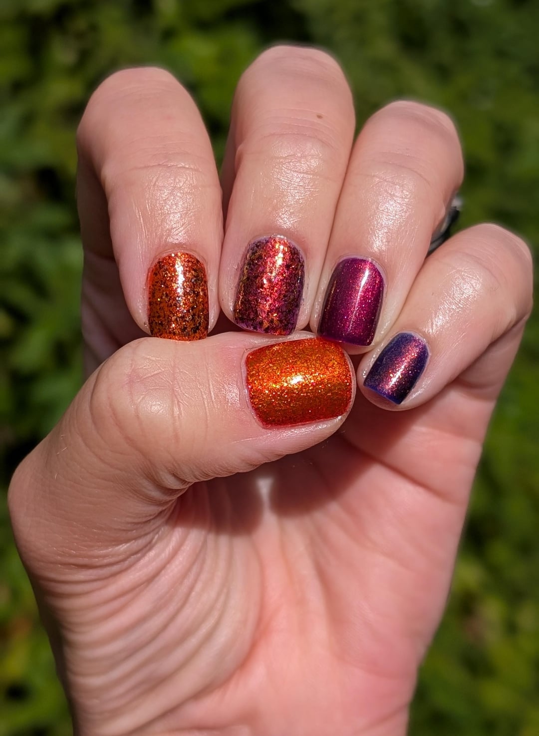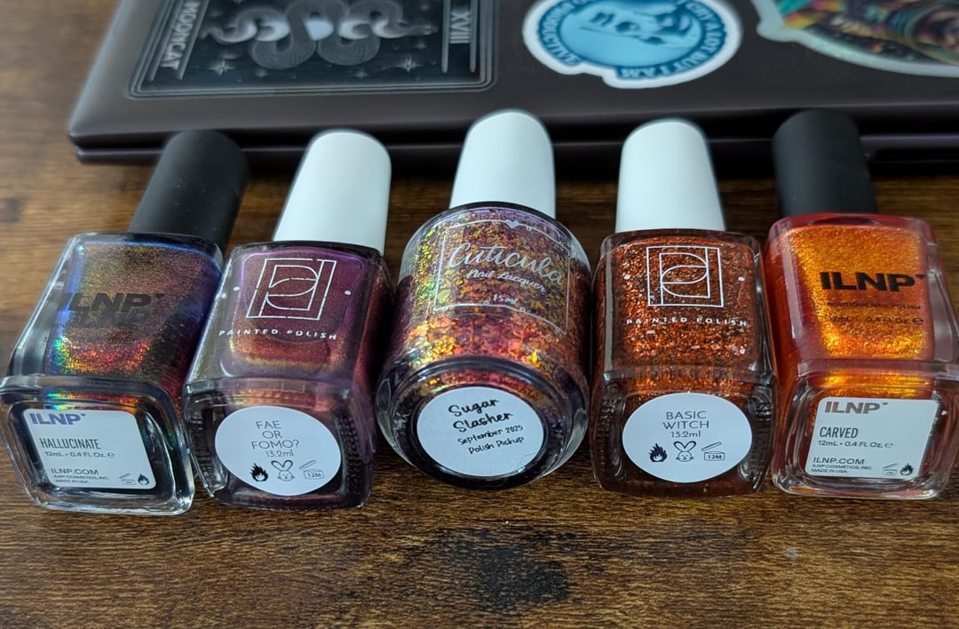 Pinky to thumb: ILNP Hallucinate; Painted Polish Fae or Fomo?; Cuticula Sugar Slasher; Painted Polish Basic Witch; ILNP Carved. by Content-Flight6371