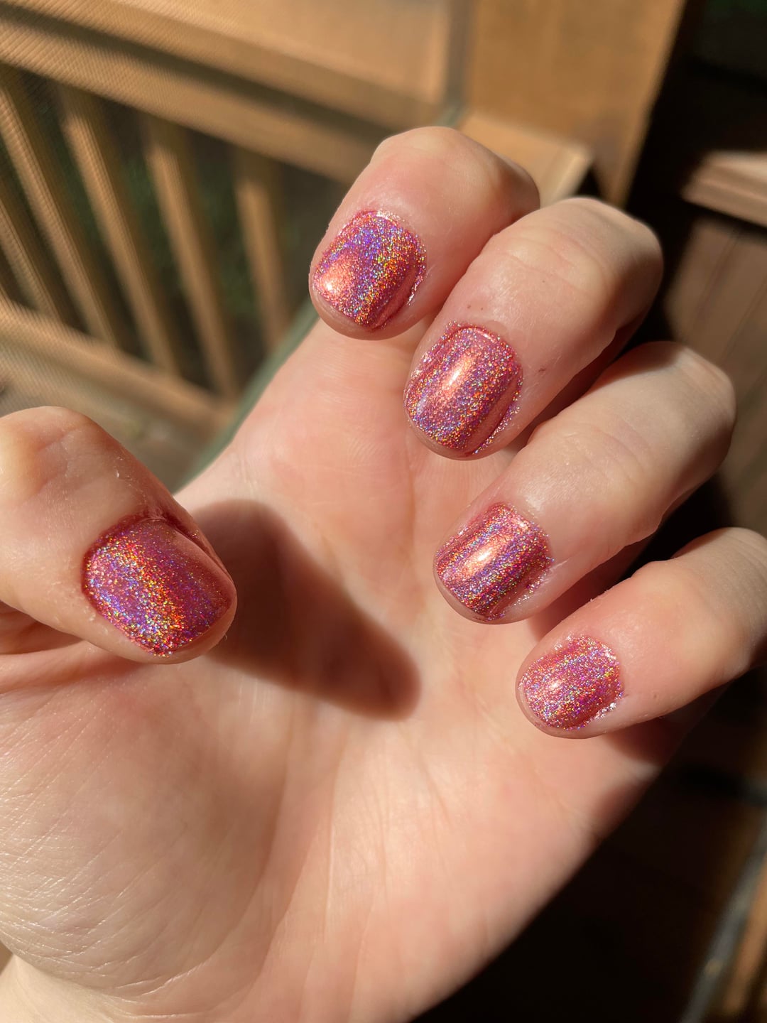 1st mani was holo taco coral chaser. I think the top and base coat were also holo taco.