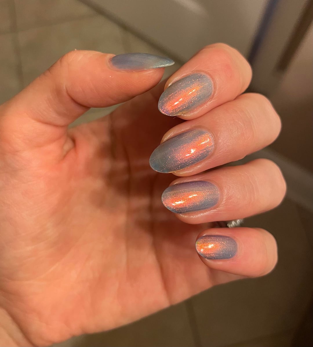 YukiBear on October 3, 2025 1:57 am 1st picture is my first time doing my nails, back in 2021. 2nd picture is my current manicure! Progress! 🙂 1st mani was holo taco coral chaser. I think the top and base coat were also holo taco. Current mani is Orly Rubberized Base Coat, Ethereal Sixth Station and Seche Vive Instant Gel Effect Top Coat