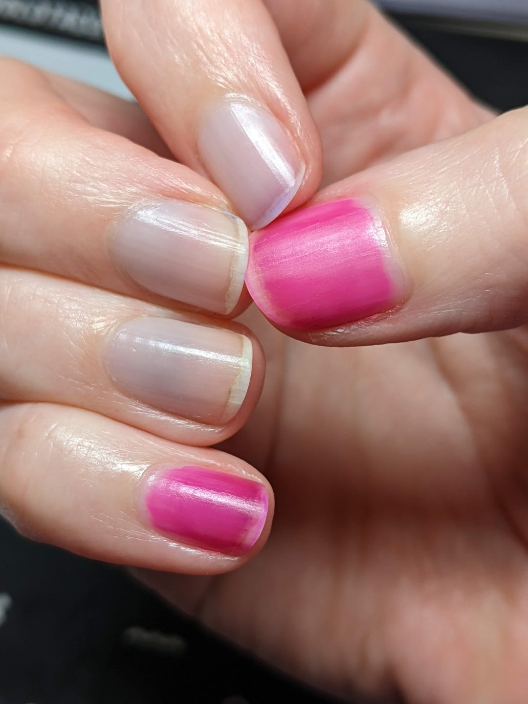I was suspicious when I was trying to do cleanup around my right thumb and it took me ages with my cleanup brush and acetone, while still leaving some neon pink tint around my nail on my skin. I wore the polish for 2 days before the magenta started chipping and then slid right off.