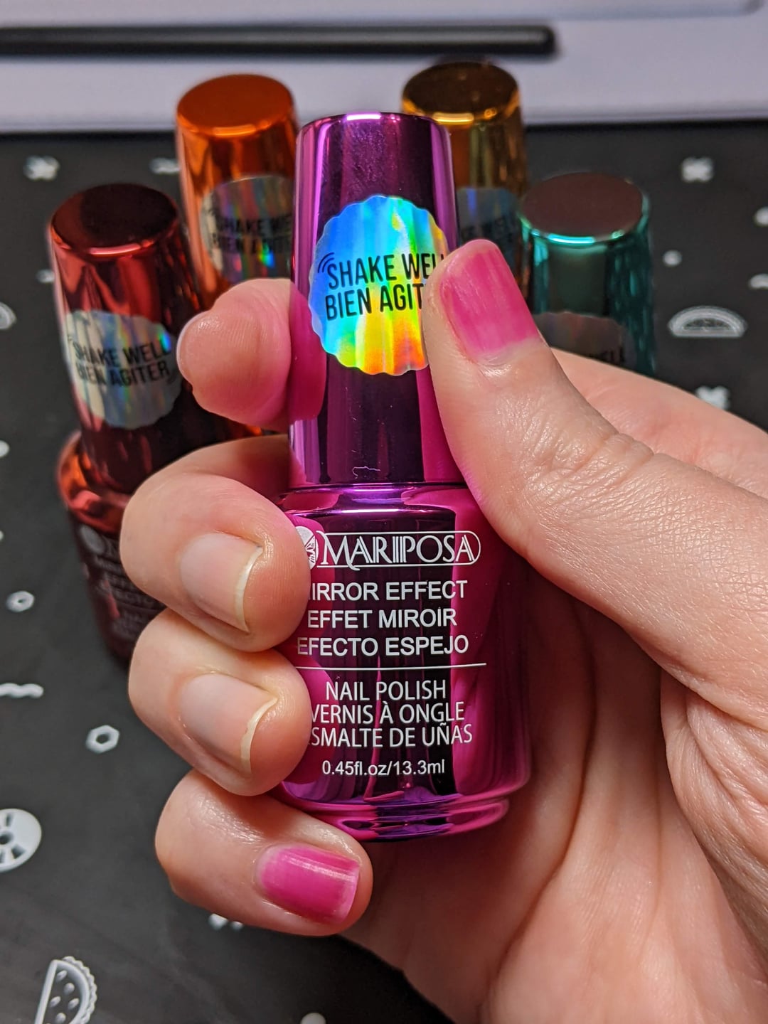 Pic 1 & 2 are after one thumb and one pinky peeled off entirely. All other colours were fine for wear. Pic 3 is after I removed all my polish with 100% acetone. I've never seen staining like this before! I don't even own a neon pink polish this bright! Pic 4 is after scrubbing with acetone, isopropyl alcohol, polish thinner, and cuticle remover one after the other. Several tries with both the acetone and isopropyl alcohol. The only one that made a bit of a difference was the alcohol, but it was slight. Pic 5 is the bottle, so you know to avoid it! 😵