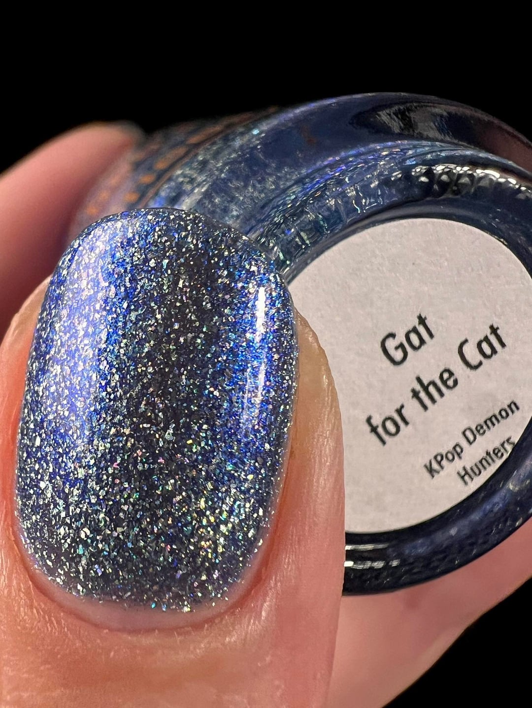 I just got my order from Bees Knees Lacquer and omg this polish. It’s from the recent KPop Demon Hunters collection and it’s inspired by the adorable Derpy the Tiger. It’s called “Gat for the Cat” (I’m not sure what that means tbh lol) but this is one of my new favorite polishes I own. It’s so glowy and sparkly and looks like magic on my finger tips.