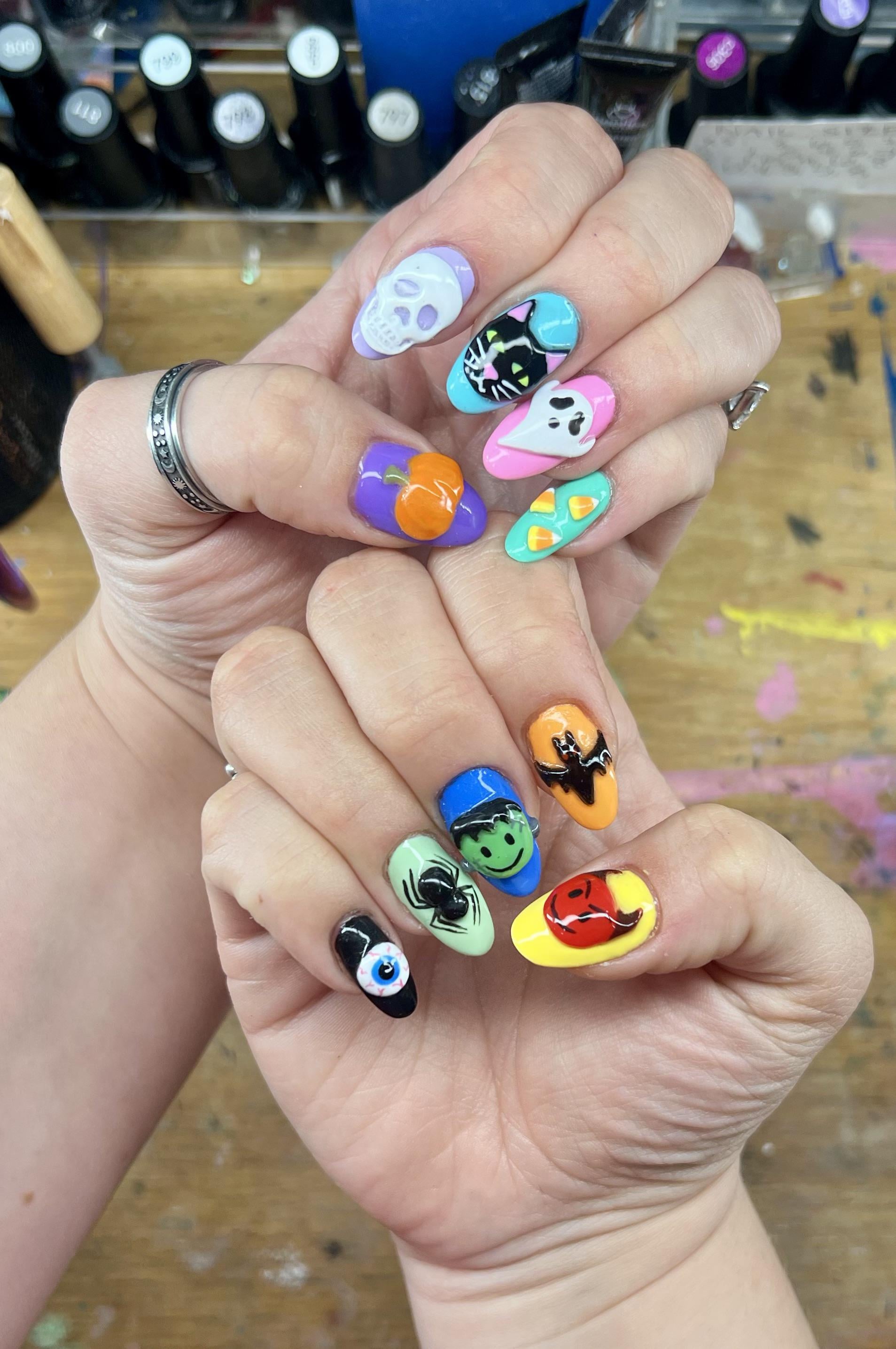 Hey friends! I’m a nail tech in training. I love to do fun designs and 3D art. These are my Halloween nails! I’ll probably change them again before Halloween, but they’re fun for spooky season. by angelswon