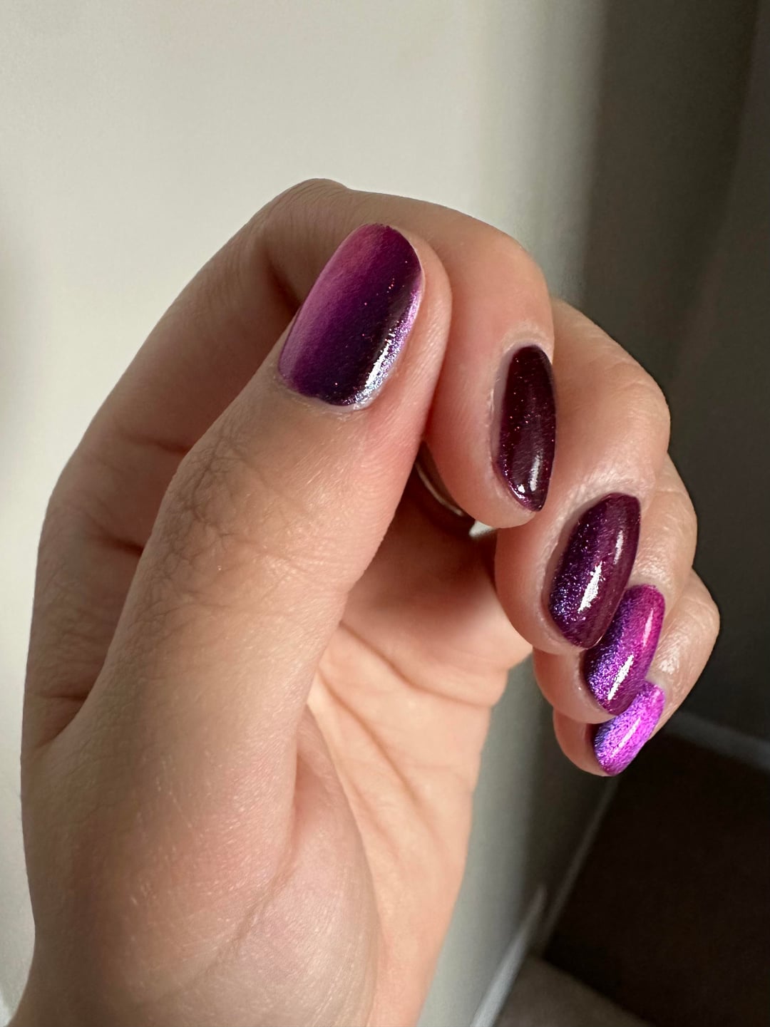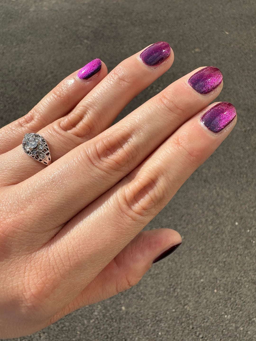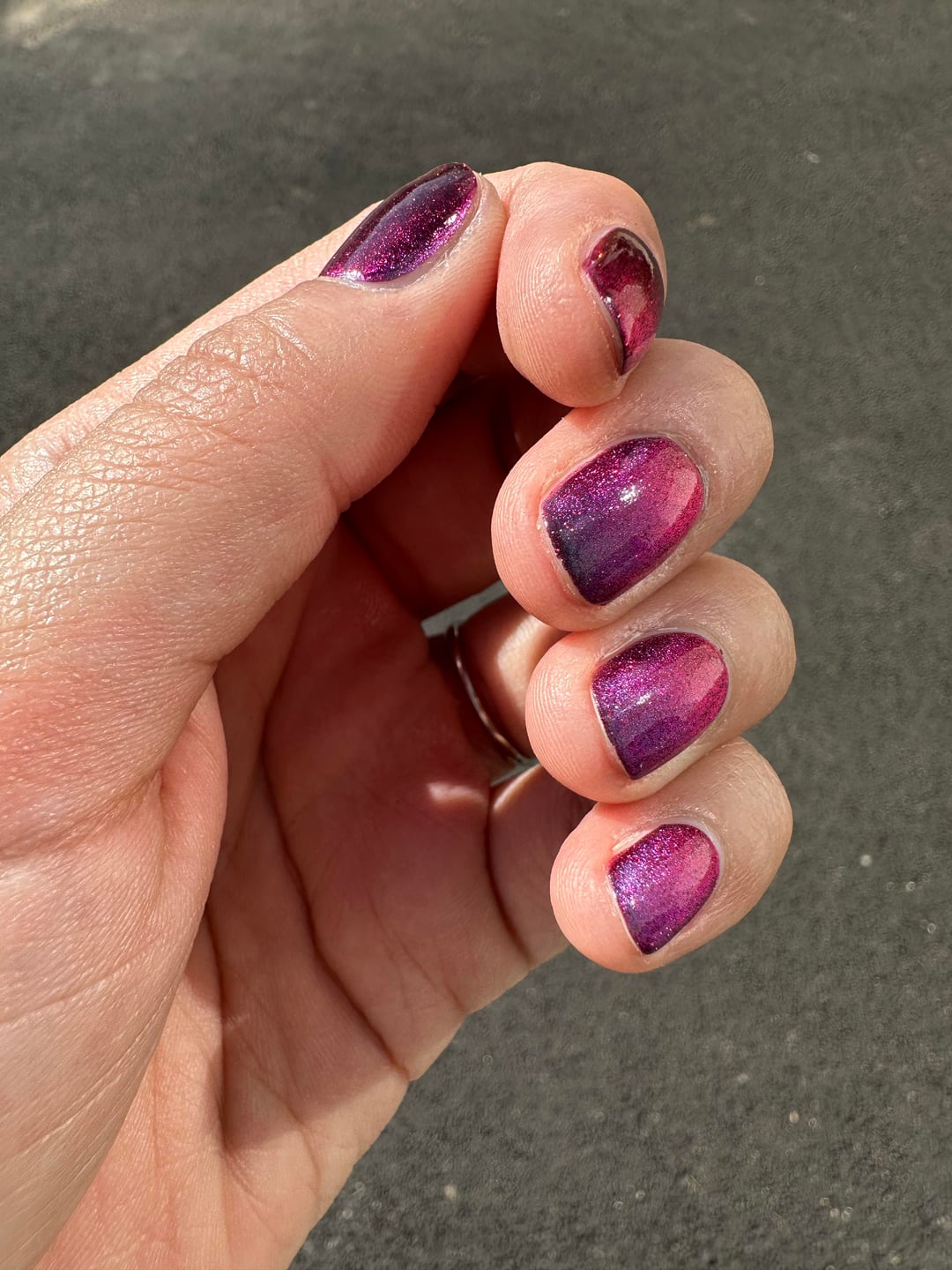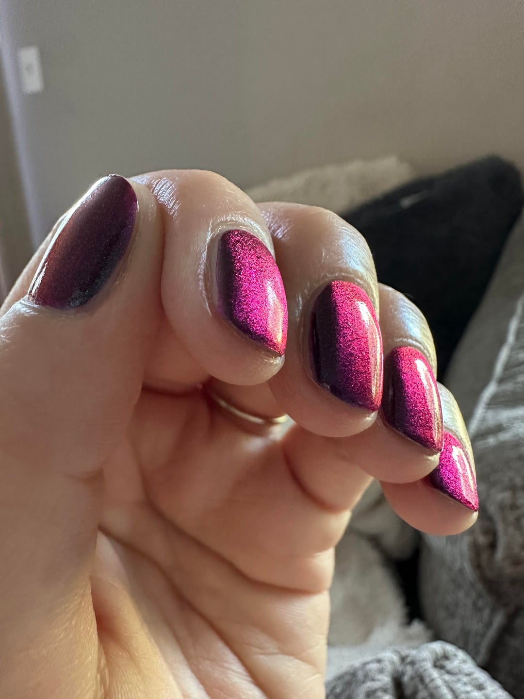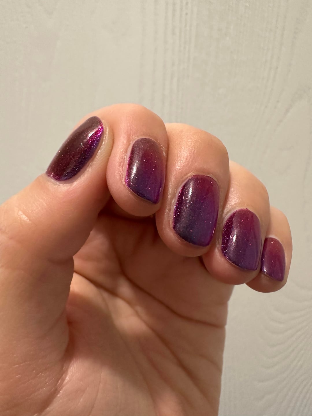 I don’t think my photos do the best job of showing this, but there’s a really interesting and pretty red holographic glitter. The magnetic pigment primarily shifts from magenta to blue but can look a green leaning teal or bright red at extreme angles. The base is so juicy, the perfect blood red color. My first GPL and I’m so impressed with the formula and finish. One of my favorite manis of the year ❤️🔥❤️🔥❤️🔥