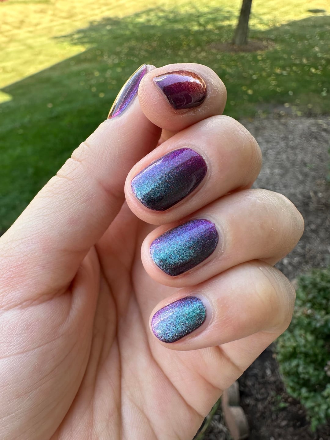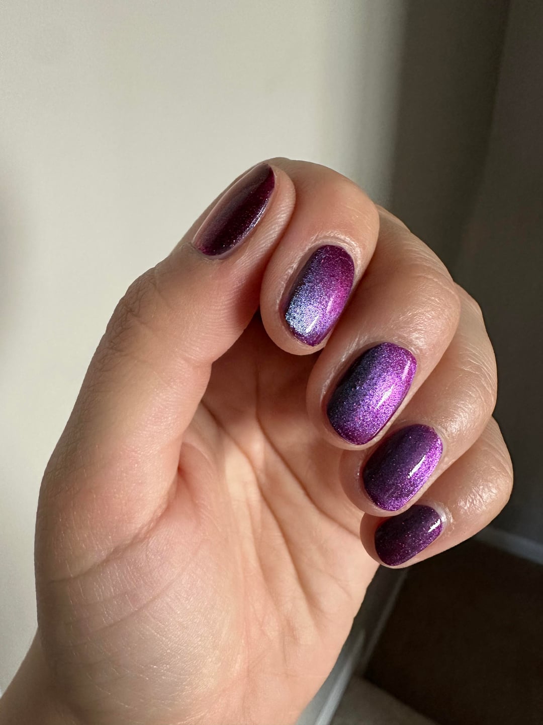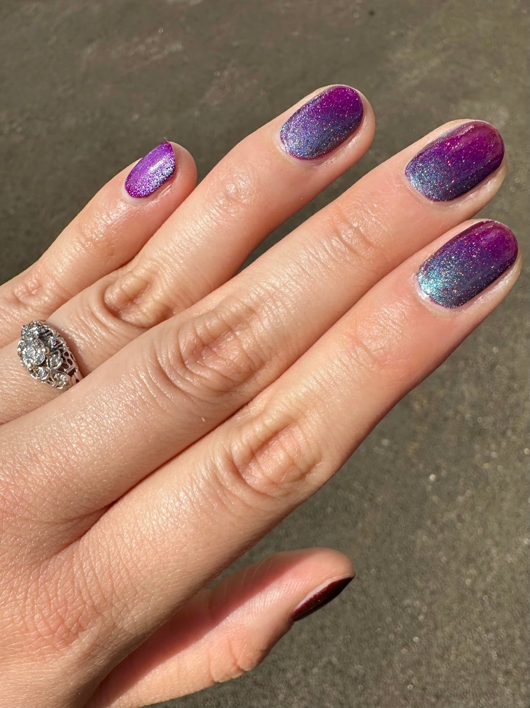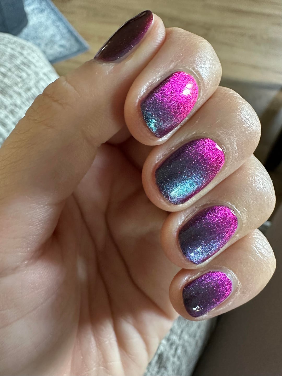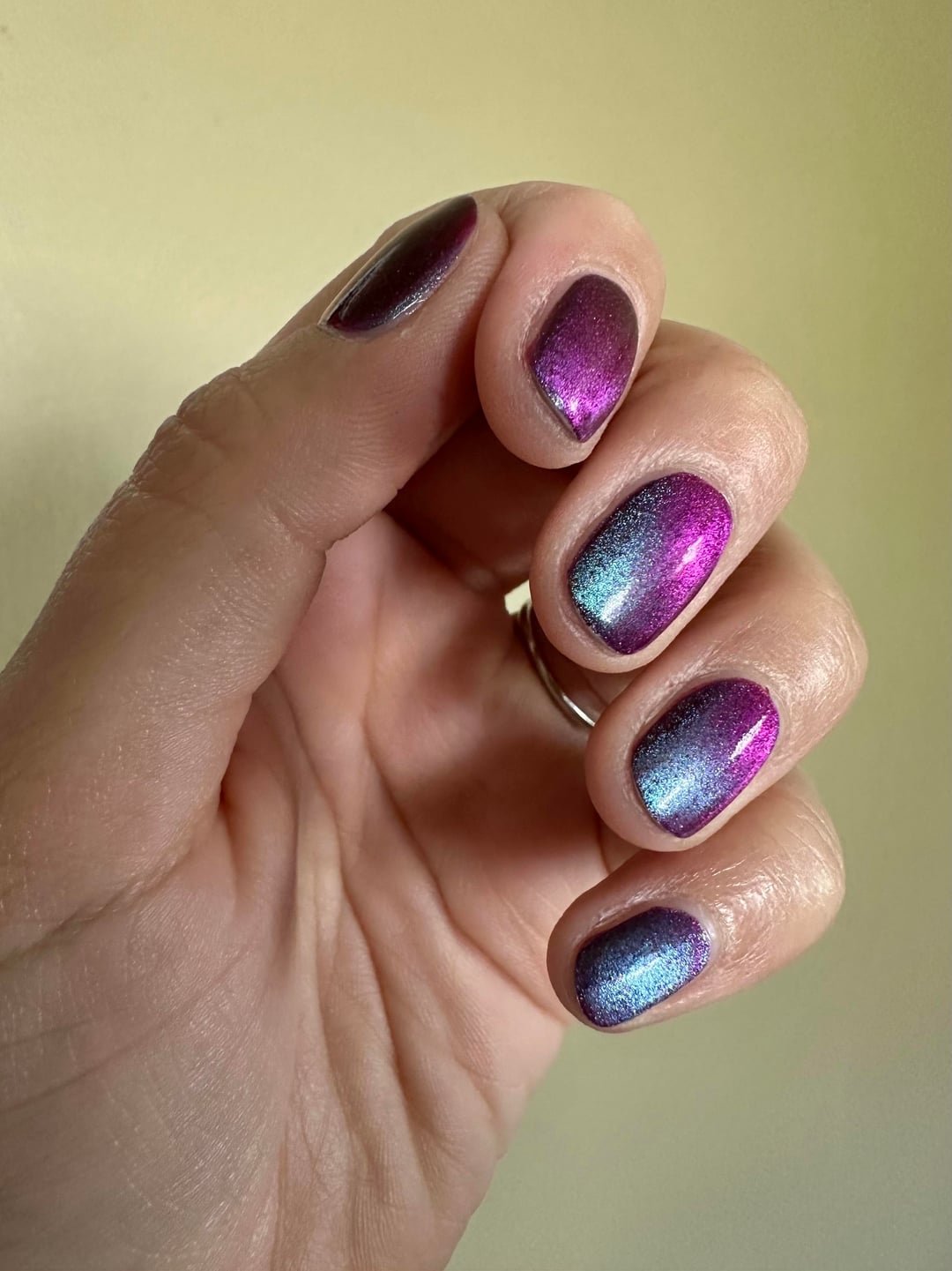 I don’t think my photos do the best job of showing this, but there’s a really interesting and pretty red holographic glitter. The magnetic pigment primarily shifts from magenta to blue but can look a green leaning teal or bright red at extreme angles. The base is so juicy, the perfect blood red color. My first GPL and I’m so impressed with the formula and finish. One of my favorite manis of the year ❤️🔥❤️🔥❤️🔥