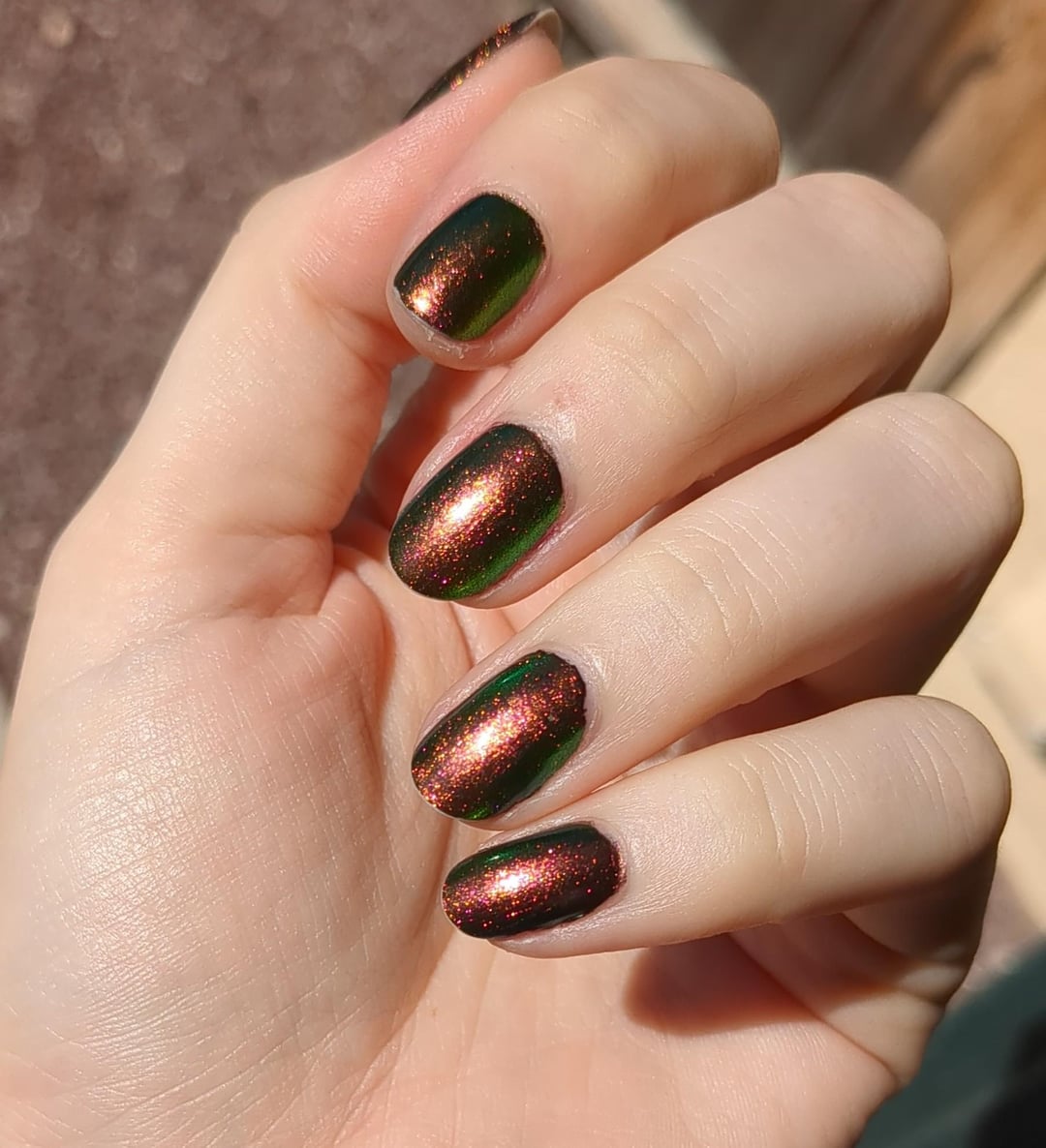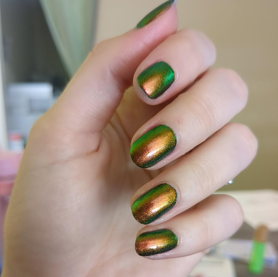 NotForPlural on October 4, 2025 6:15 pm Base: nailtek 2 1 coat of Color Club’s black, which was quite lovely too 1 thick coat of Ruby Throated Hummingbird by Phoenix Top coat: KBShimmer Clearly on Top
