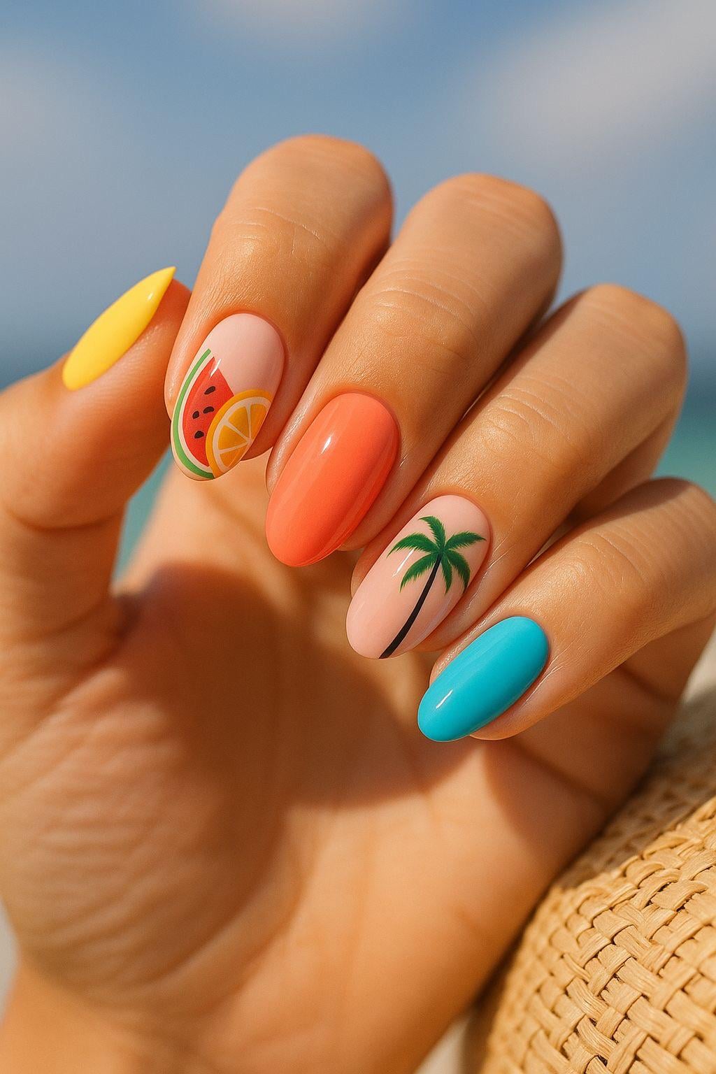 I wanted something that screams vacation mode on, so I went for these tropical nails β€” fruity details, palm trees, and bold summer colors. πŸŠπŸ’™