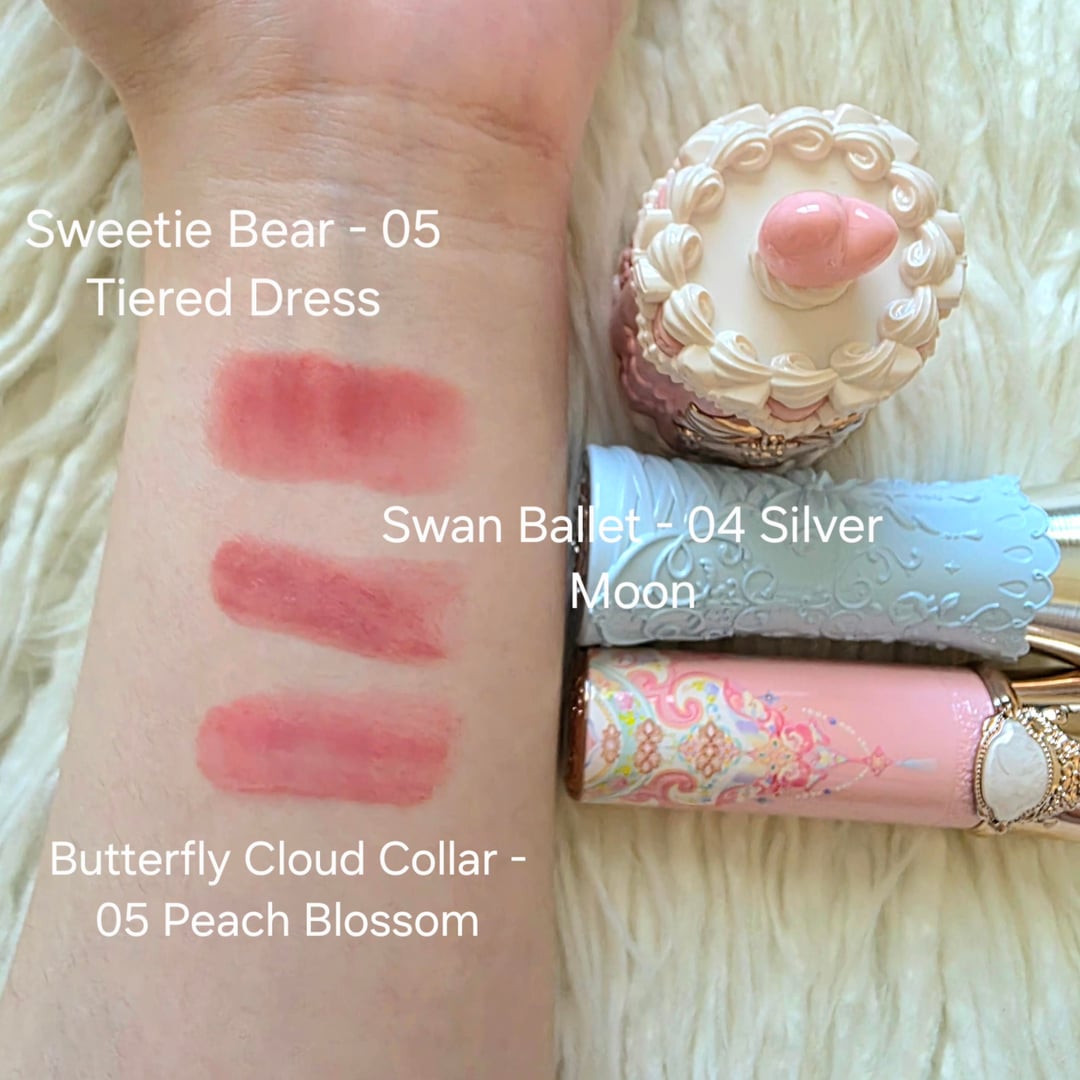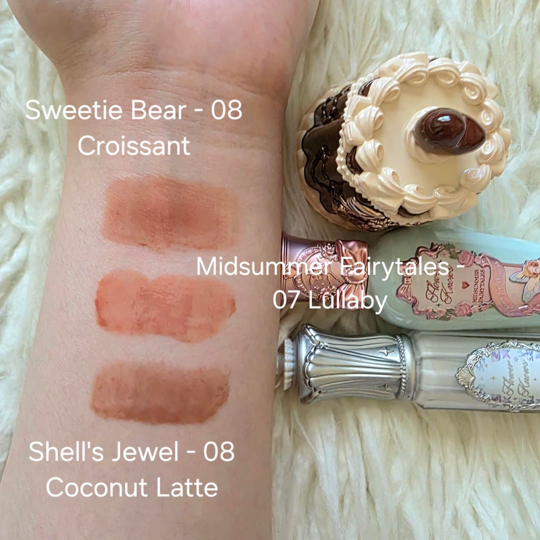 COATING LIP JELLIES: I think I have found my new favorite lip formula. The best way I can describe the texture is that they feel like a glossy liquid lipstick. I know that makes no sense, keep reading. This product spreads super thinly and evenly with the included applicator. Btw, they lengthened the applicator wand, so if you hated the Strawberry Cupid lip cream applicator, you'll love this one. You don't have to smack your lips together after applying the lip jelly, due to how smoothly and evenly it applies. It feels super thin and not goopy or sticky at all on the lips. And since it is a gloss, it is obviously not drying at all. It claims to be transfer-proof, which is somewhat true, but I still had a bit of the color (not just the clear glossy surface) transfer when I drank water. And it definitely needs to be reapplied after eating. I choose the colors JE05 Tiered Dress and JE08 Croissant. JE05 Tiered Dress is a neutral-toned medium pink color that pairs very well with the Strawberry Milk palette. One problem I have with many pink lip glosses is that they're often too cool-toned for me. But this color was perfect for me. Not sure why JE08 Croissant is showing up brown on my arm swatches, but on my lips, it shows up as a reddish brown color that looks just like the Bear Biscuit blush. Weird, since the other 2 brown Flower Knows lip glosses I'm comparing it with look the same on my lips as they do in my swatches, but Croissant looks completely different. Not mad about that since I do love that reddish brown color.
