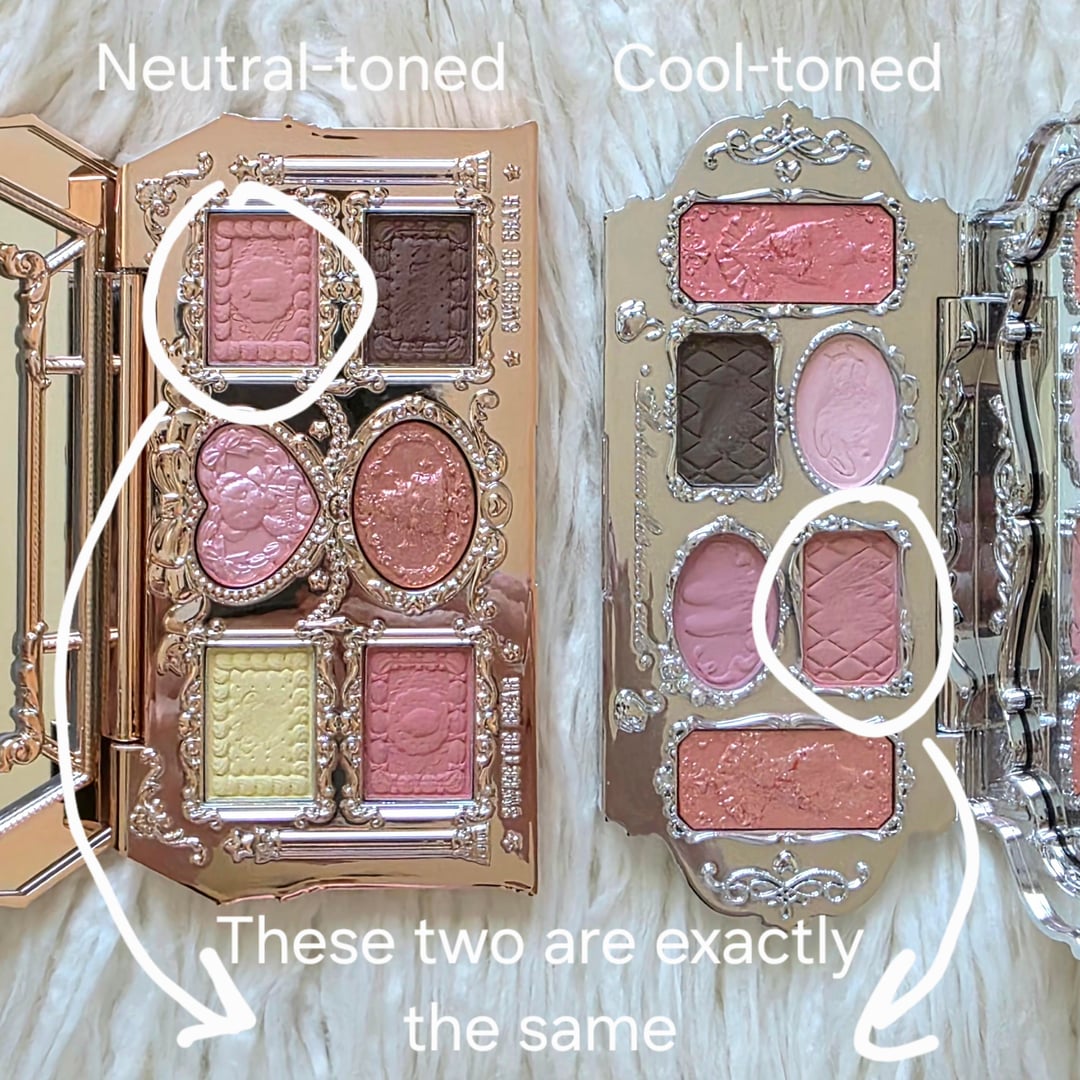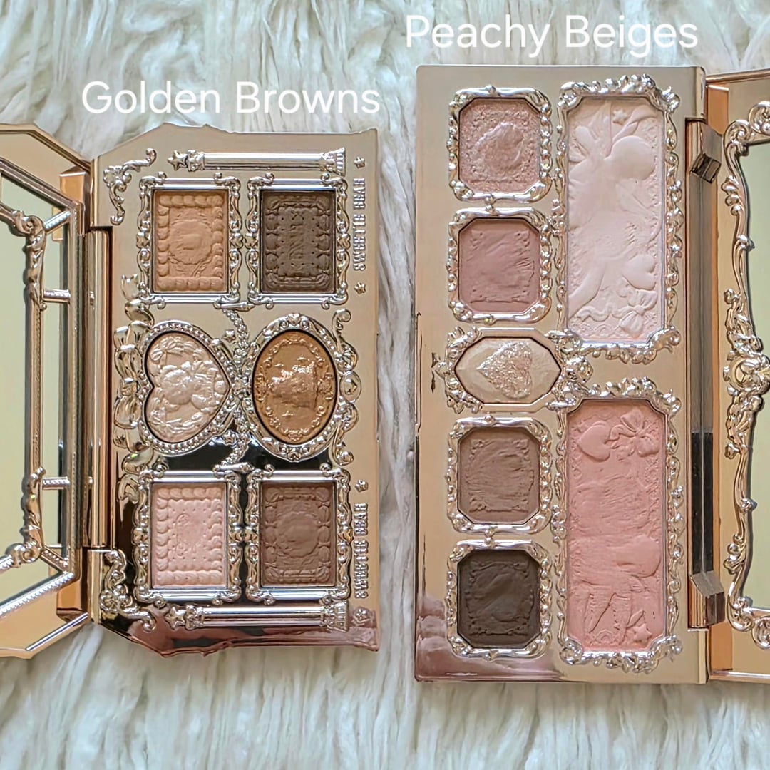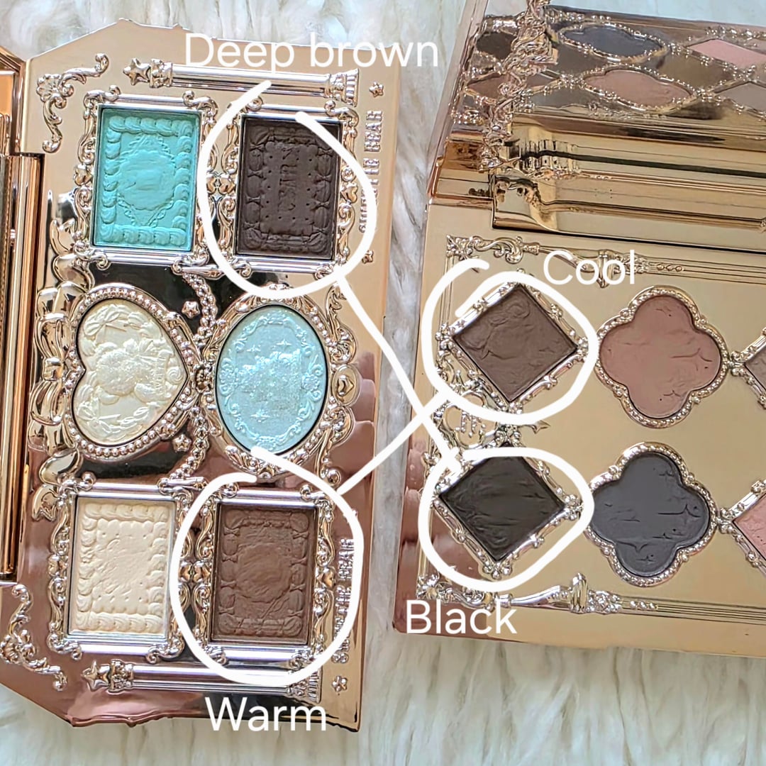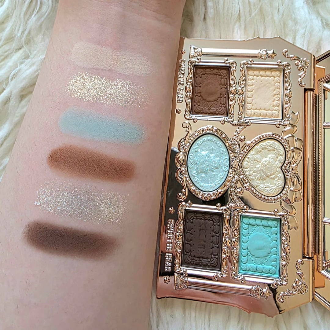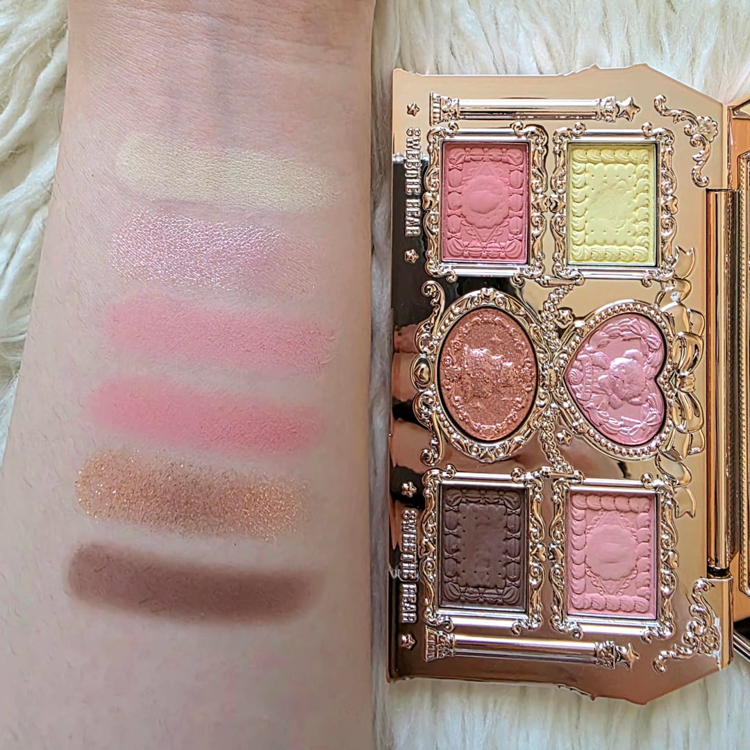 02 STRAWBERRY MILK PALETTE: A warmer toned version of their Swan Ballet palette in 03 Pink Swan. The pale pink shimmer shade on the top middle is completely metallic with no glitter at all. The darker pink shimmer shade below it is very warm-toned (almost red), and the formula is the same as the darker gold in the Buttery Croissant palette. The pastel yellow shade on the top left just shows up clear on me, so don't get it if you're hoping for an actual yellow eyeshadow. The peachy-pink shade on the top right is exactly the same as the middle top right shade in the Pink Swan palette. Since I am warm-toned, I prefer Strawberry Milk over Pink Swan by a lot, but if you're cool-toned, I'll stick with Pink Swan.