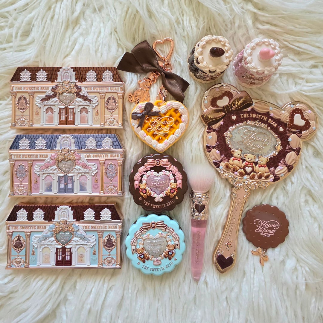 TL;DR: Hair clip too heavy and unusable, blush brush domed-shaped and densely packed bristles, hand mirror cute but small and heavy with very light handle, waffle powder cute but too small, Buttery Croissant palette is warm golden neutrals, Strawberry Milk is warm-leaning neutral pinks, Mint Chocolate palette not really "mint", Berry Parfait and Bear Biscuit blushes pigmented, lip jellies so good.