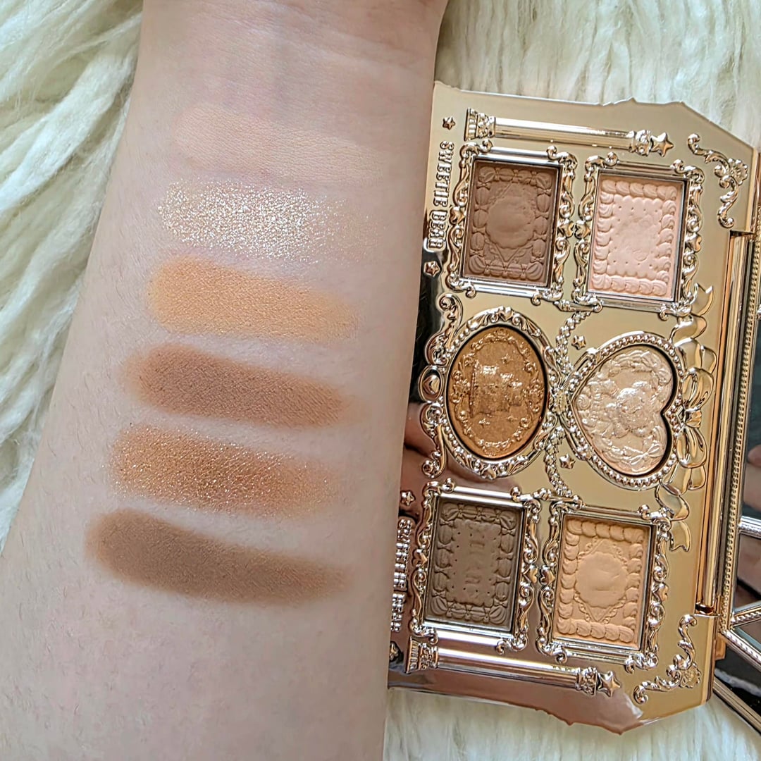 01 BUTTERY CROISSANT PALETTE: An extremely warm-toned golden neutrals palette that's perfect for us warm autumns. For reference, I have light (not fair) yellow-toned skin. I'm currently wearing the Tarte Face Tape foundation in 20S Light Sand. This color story is very similar to that of the Urban Decay Naked Honey palette. I think it's perfect for doing a subtle/toned-down version of the 2016 makeup look. The pale gold shade on the top middle have very chunky glitters, while the darker gold below it have finer glitter particles. Compared to their Strawberry Cupid palette in Honey Canele, it is much more yellow and gold, darker, and even more warm-toned. I love it for my skin tone, but I wouldn't recommend this palette for cool-toned skin since it is very warm.