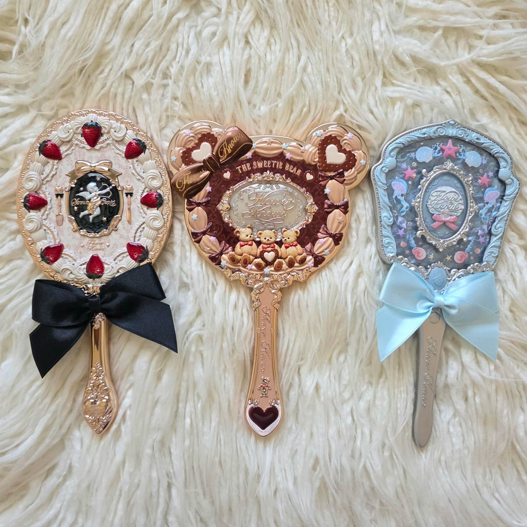 HAND MIRROR: Like always, Flower Knows' hand mirrors are always much smaller than I'd like, and the heads are so heavy while the handles are so light. But obviously their designs are cute. This one is larger than the Shell's Jewel hand mirrors, and about the same size are the Strawberry Cupid hand mirrors. It's a horizontal oval-shaped mirror, whereas the Strawberry Cupid ones are vertical. Usablilty-wise, I prefer Strawberry Cupid, but design-wise, I like Sweetie Bear a lot more.