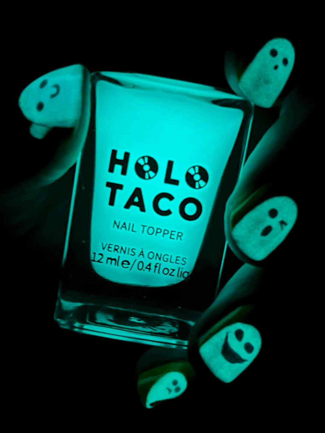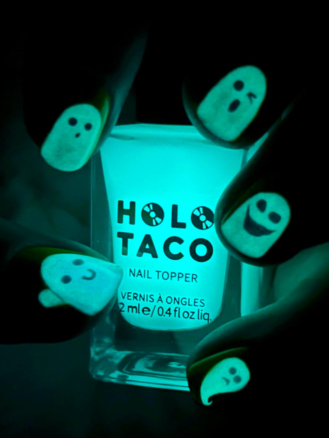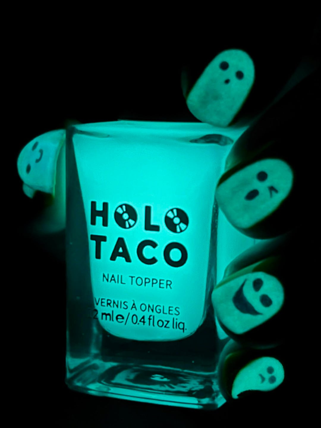 This glow in the dark topper is so bright especially over a white or light colored crème. I found it still glowed HOURS after I went to sleep and every time I went to flip my pillow I can see my nails glowing 😻.