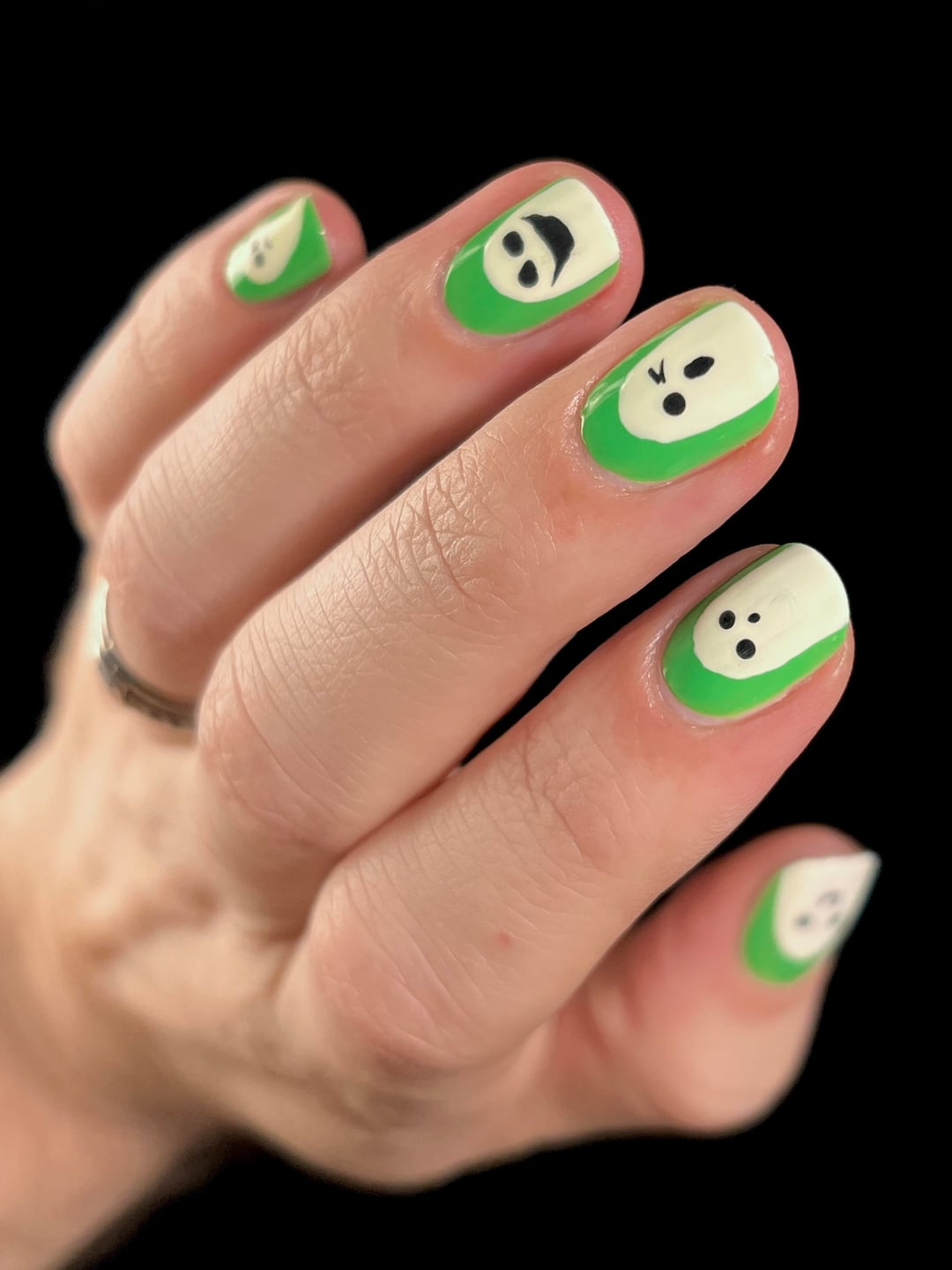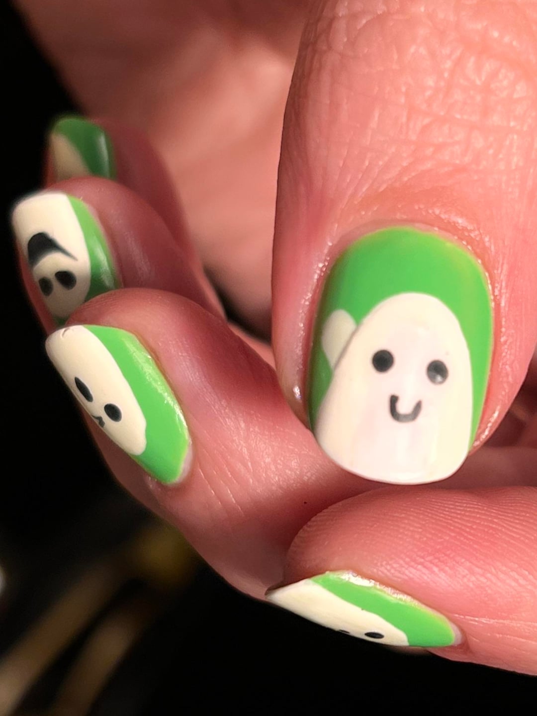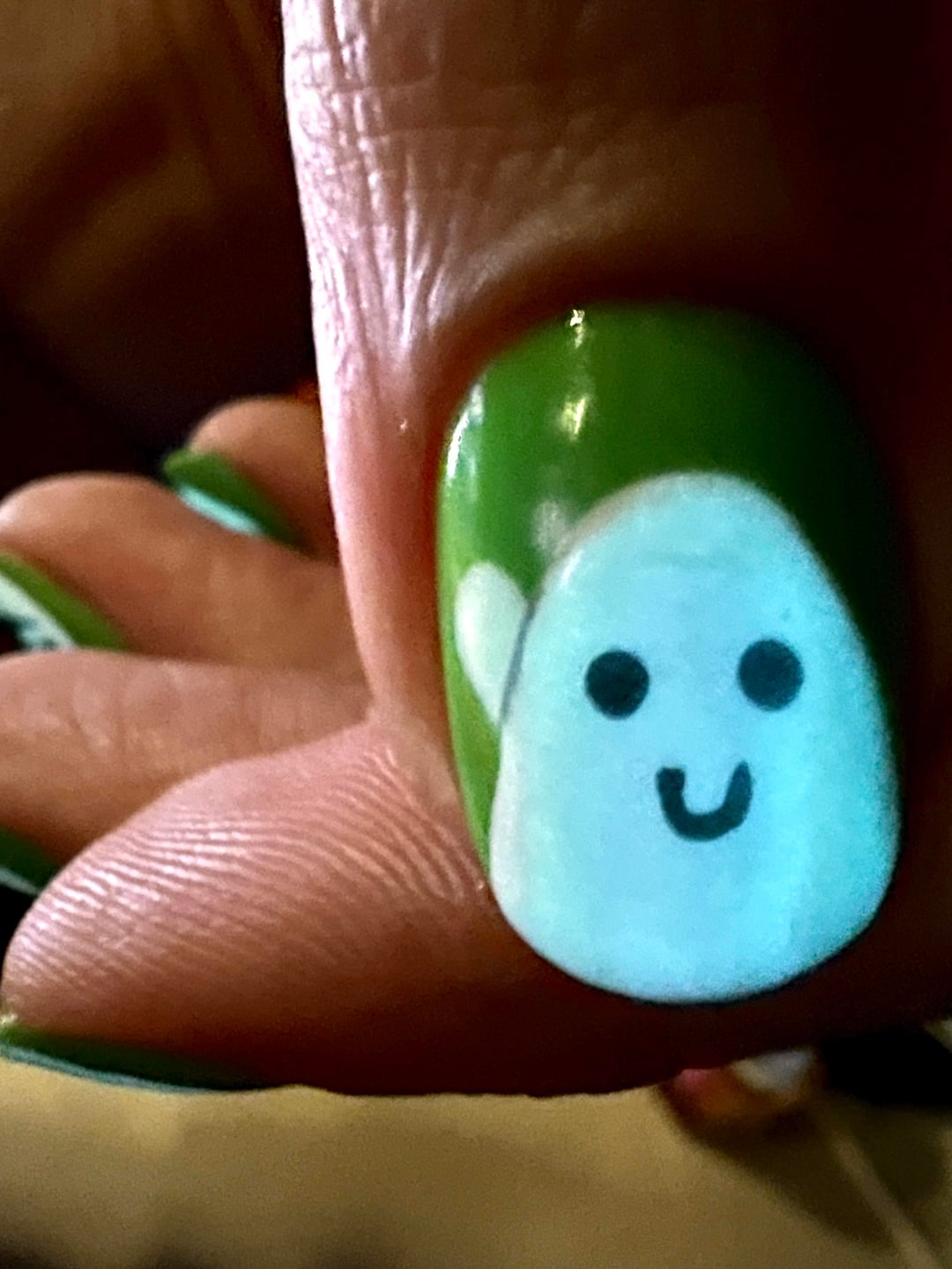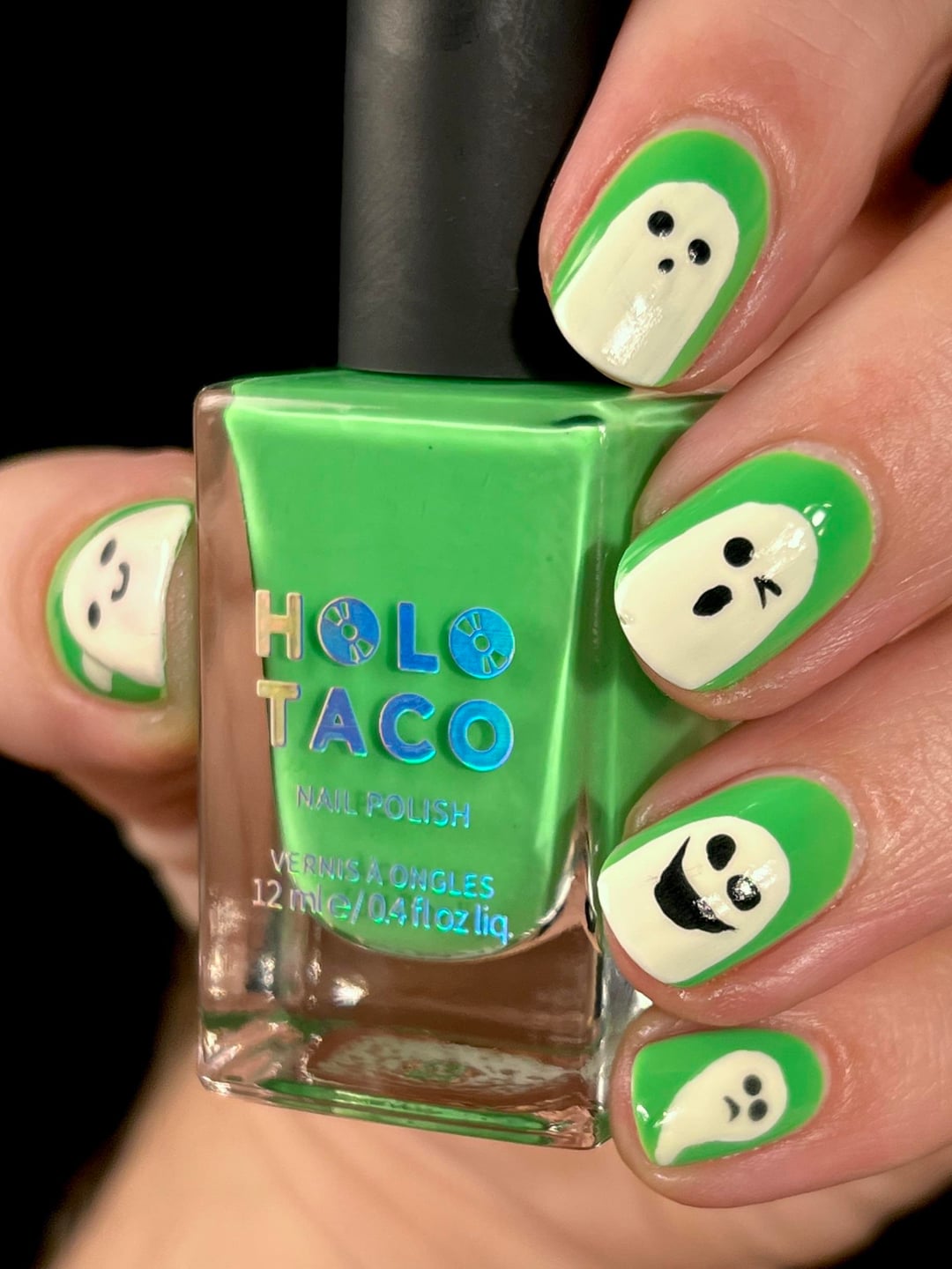 I’m wearing it here in one coat over these cute little white ghosts I painted on with “Not Milky White” . I also am wearing the bright plasma green crelly in this mani that launched as part of the new Holoween collection it’s called “So Toxic”