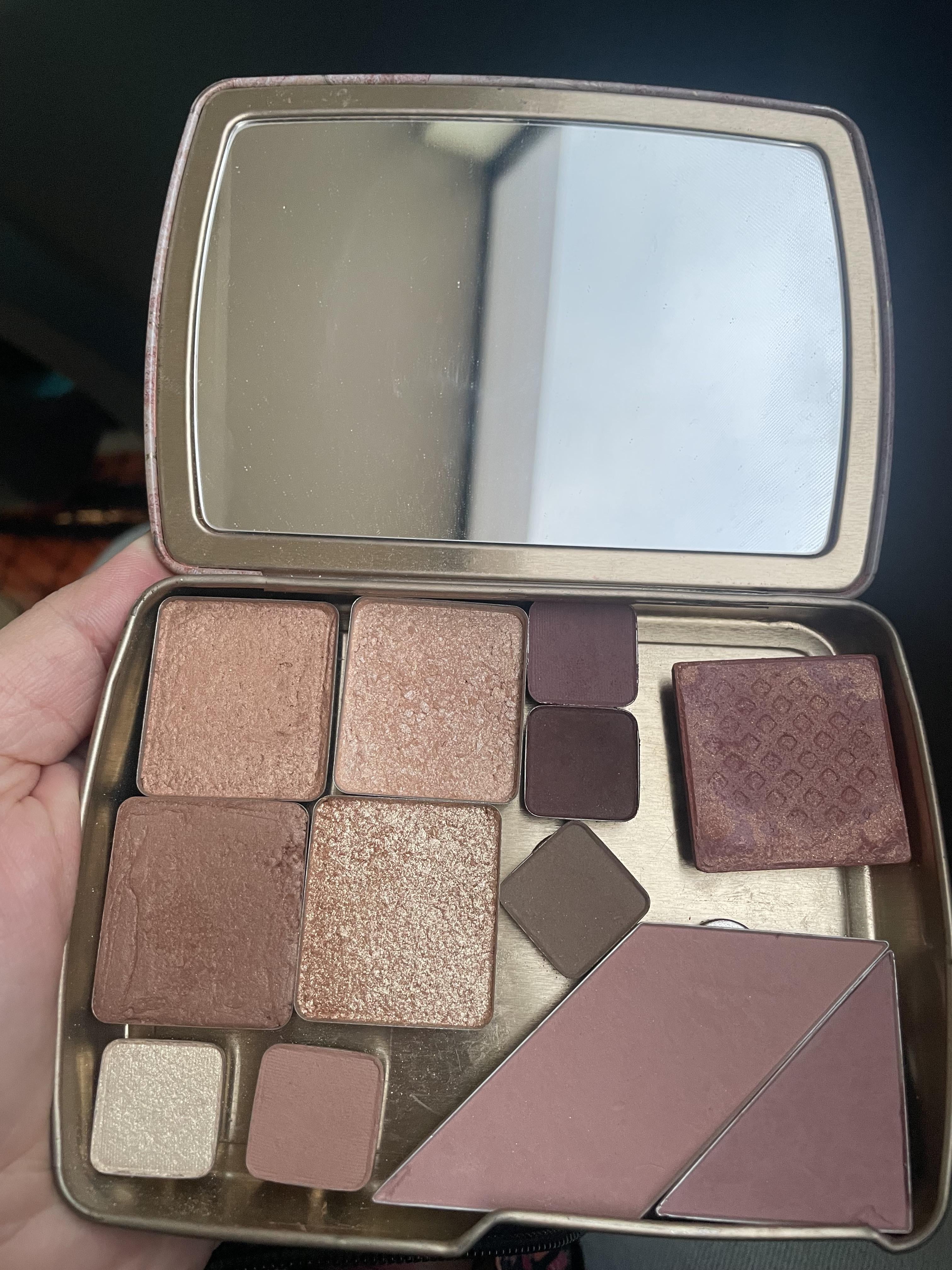 This is my new (old) custom pallet of new and old products. I have been working on the Hourglass Ambient lighting edit 2021 holiday pallet for YEARS, and after totally panning 3/5 of the shades I decided to buy empty pans that I can repot other partially panned products and repurpose the metal tin.