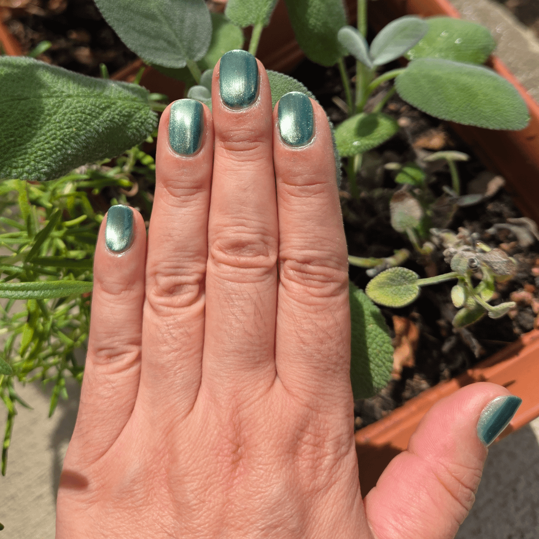First set of pics is Bee’s Knees Lacquer Bog Dweller, second is BKL Feo, Fuerte, y Formal. Both with Mooncat Getting Even base coat and Vibrant Scents quick dry topcoat.