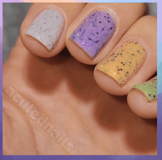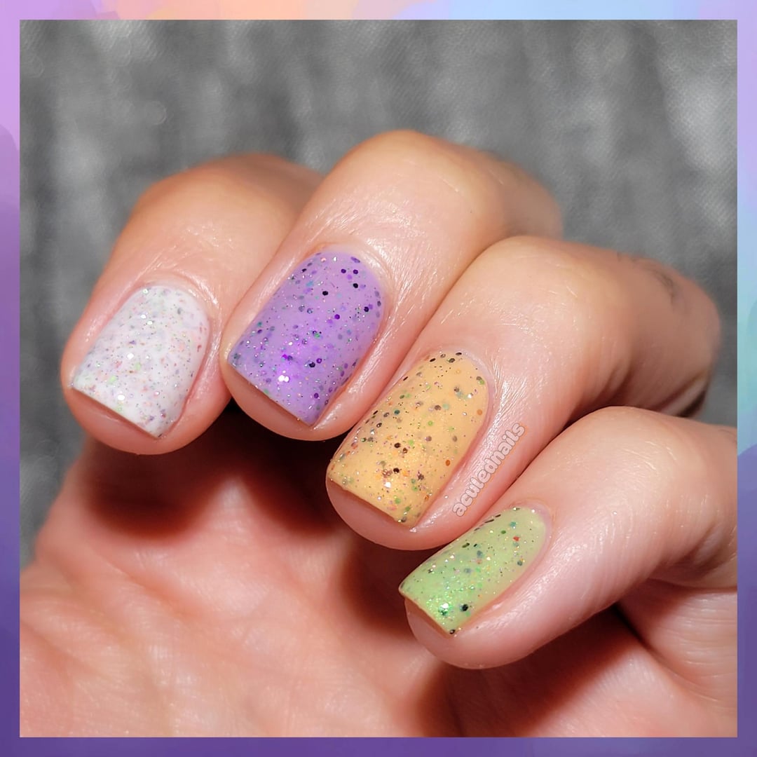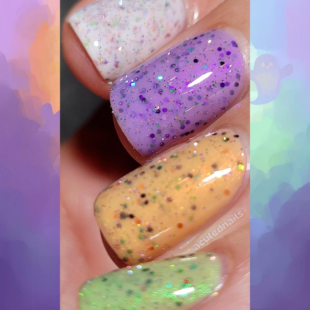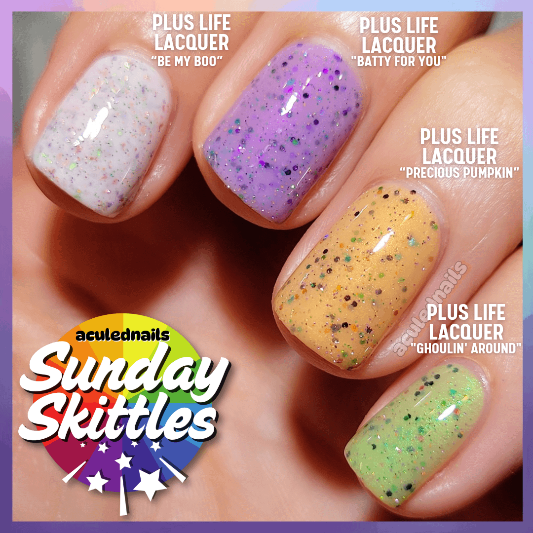 I got the new "Hallowdays With Bae" collection from Plus Life Lacquer sent to me to swatch, and they made a fantastic cute skittle that I couldn't resist putting them together for Sunday! I was never a crelly fan, but in the past few years, Summer has totally converted me with such cute crelly combos. Fantastic on their own, but great for a background to nail art. The pastel metallic flakies in is a stand out for me, such a fun almost retro Hallowee color palette. I also tossed the reflective topper on them all for some extra pizzazz. 👻✨️ They are all currently available on their website!