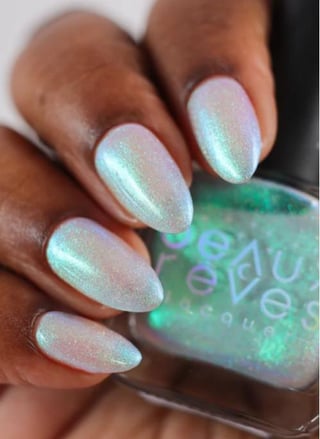 I have Cirque Colors’ Serenity which is very similar to these! It seems a little more opaque though so idk how it would be as a topper but I thought I’d mention anyway. I think they have another color with a more blue undertone, Serenity is pretty green. Their Pearl Nacre collection has all different undertones like these and they’re gorgeous